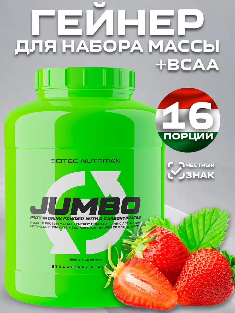 Хотите нарастить мышцы эффективно и качественно? Тогда наш высококалорийный гейнер Jumbo Scitec Nutrition идеально подойдет для вас! Смесь для спортивного питания в виде сухого порошка для разбавления водой содержит все необходимые вещества для набора массы и роста мышц. Коктейль, приготовленный с помощью нашего продукта, станет полезным и вкусным дополнением к вашему рациону. Получите профессиональный результат без лишних усилий! Состав и пропорции подобраны так, чтобы питательные вещества из него по максимуму способствовали росту мышечной массы. Специальная формула спортпитания содержит 53 грамма белка и 135 г углеводов на 1 порцию, за счет чего поможет набрать и достичь желаемой формы тела. Углеводный состав продукта также впечатляет: в его состав входят разнообразные углеводы, в том числе быстро и медленно усваивающиеся.