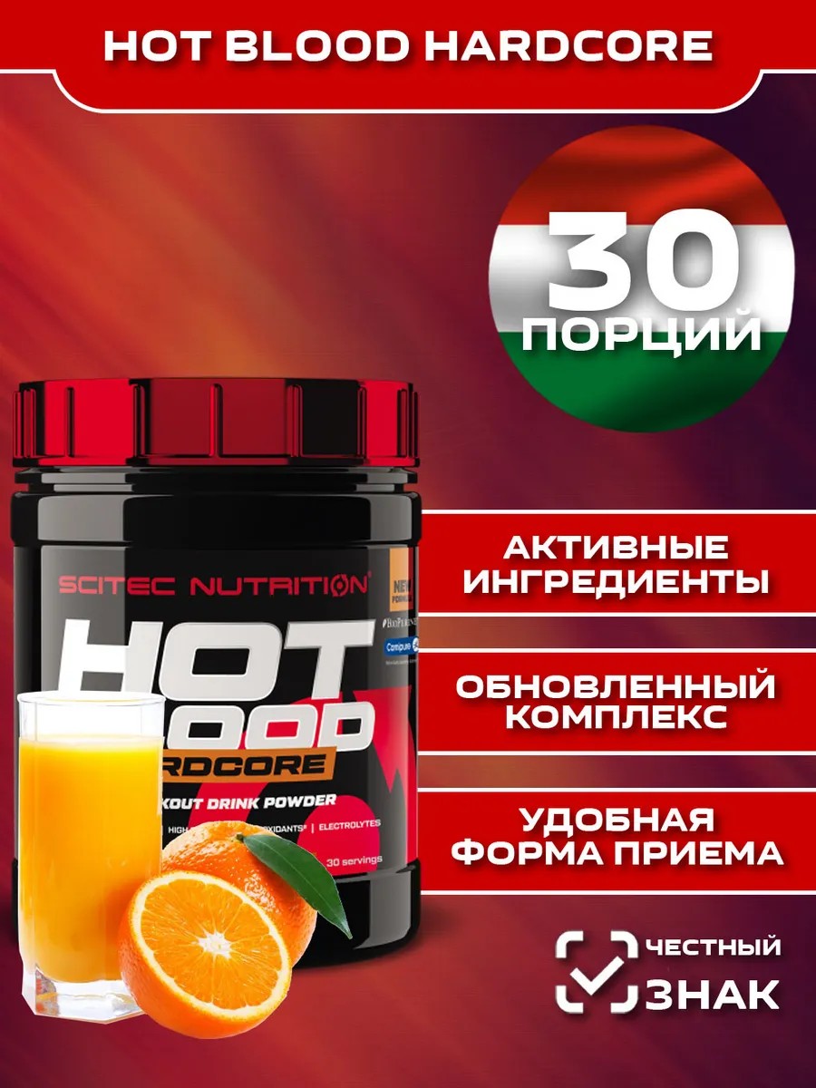 Обновленный комплекс активных ингредиентов HOT BLOOD HARDCORE поддерживает ваше тело во время физических нагрузок и высокоинтенсивных тренировок, так как научно доказано, что 3 г креатина в продукте повышают производительность во время последовательных, коротких, высокоинтенсивных упражнений, таких как силовые тренировки или интервальные кардио! Витамин В6 и ниацин способствуют нормальному функционированию нервной системы. Хром участвует в нормальном метаболизме макроэлементов. Биотин участвует в нормальных метаболических процессах по выработке энергии. Витамин С способствует защите клеток от окислительного стресса. Фолат, витамин В12 и витамин А способствуют нормальному функционированию иммунной системы.