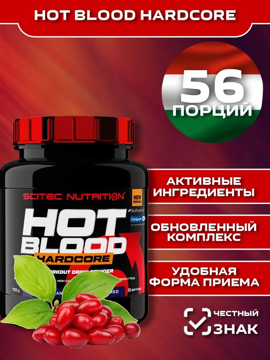 L-Glutamine, Guarana Extract (Guarana Seed Extract, Maltodextrin, Caffeine), Colors (Sulfite-Ammonia Caramel, Carmine, Brilliant Blue FCF), L-Ascorbic Acid, Ginger Rhizome Extract, L-Ornithine Hydrochloride, L-Leucine, Acidity Regulator (Sodium Carbonates), Calcium β-Hydroxy β-Methylbutyrate, Carnipure L-Carnitine L-Tartrate 0.2%, Ginkgo Biloba Leaf Extract, Zinc Bisglycinate, Nicotinamide, DL-Alpha Tocopheryl Acetate Preparation [DL-Alpha Tocopheryl Acetate, Anti-Caking Agent (Silicon Dioxide)], L-Valine, L-Isoleucine, Choline Bitartrate, Grape Seed Extract, L-Lysine Hydrochloride, Betaine, Nicotinic Acid, Retinyl Acetate Preparation [Stabilizer (Gum Arabic), retinyl acetate, antioxidant (alpha-tocopherol), anti-caking agent (calcium phosphates)], BioPerine black pepper fruit extract 0.007%, pyridoxine hydrochloride, D-biotin, pteroylmonoglutamic acid, chromium picolinate, cyanocobalamin.Предтренировочный комплекс HOT BLOOD HARDCORE 700 грамм