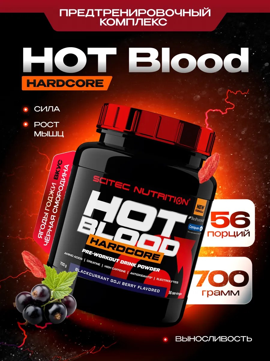 Hot Blood Hardcore – это не просто предтреник, а полноценный спортивный комплекс с адаптогенами, который поможет вам увеличить продуктивность тренировок, почувствовать мощный памп и значительный буст энергии уже после первой порции.