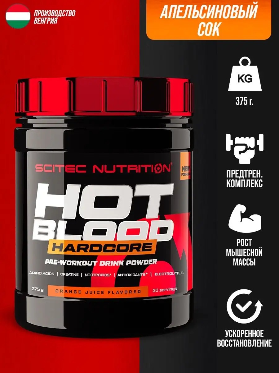 Представляем вашему вниманию особо мощный энергетический предтренировочный комплекс Scitec Hot Blood HARDCORE. Его отличает небывалая эффективность, вы можете убедиться уже после первого скупа, что этот препарат создан для людей, любящих спорт не только за результат, но и за невероятные ощущения в зале. Причём Hot Blood купить вы можете как для занятий с отягощением, так и для кардиотренировок, в том числе высокоинтенсивных. Учитывая оптимально продуманный состав, препарат рекомендуют без опаски даже для тех видов тренинга, в которых пульс повышается до серьёзных показателей.- разгоняет кровь;- увеличивает скорость метаболизма;- придаёт сил;- повышает уровень выносливости;- помогает сконцентрироваться;- улучшает мышечный пампинг Кроме того, этот комплекс хорошо сочетается с ВСАА и с протеиновыми коктейлями: вместе они создают отличный тандем, дающий максимальный результат. Мышцы приобретают точёную форму, уплотняются, быстро и эффективно растут.
