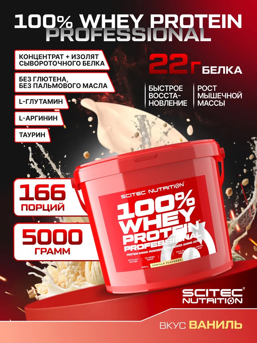 100% Whey Protein Professional от Scitec Nutrition — это высококачественный мультикомпонентный сывороточный протеин, созданный на основе концентрата и изолята сывороточного белка. Благодаря сбалансированной формуле с дополнительными аминокислотами и пищеварительными ферментами, этот белковый порошок идеально подходит как для набора мышечной массы, так и для похудения, сушки и поддержки формы.