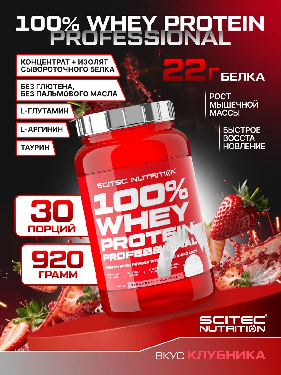 100% Whey Protein Professional от Scitec Nutrition — это высококачественный мультикомпонентный сывороточный протеин, созданный на основе концентрата и изолята сывороточного белка. Благодаря сбалансированной формуле с дополнительными аминокислотами и пищеварительными ферментами, этот белковый порошок идеально подходит как для набора мышечной массы, так и для похудения, сушки и поддержки формы.