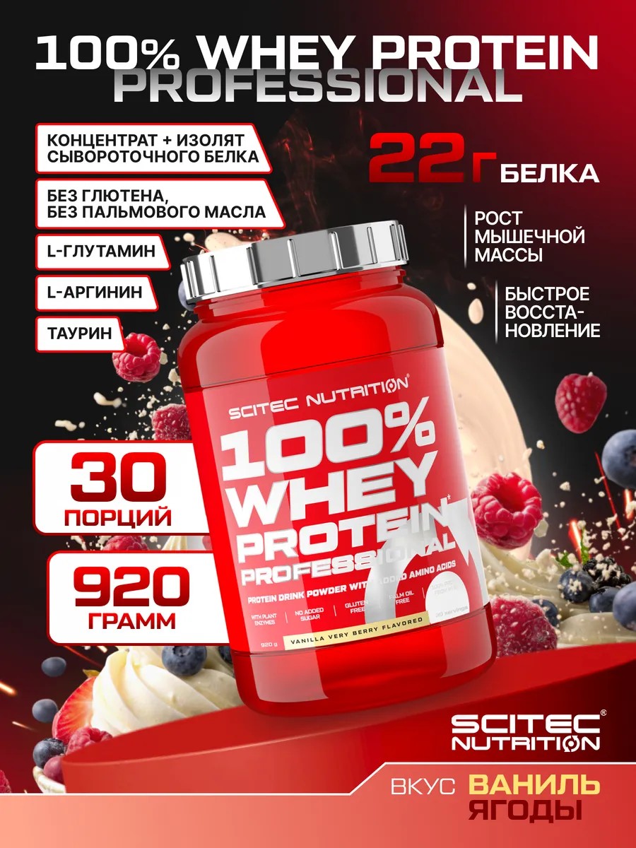 100% Whey Protein Professional от Scitec Nutrition — это высококачественный мультикомпонентный сывороточный протеин, созданный на основе концентрата и изолята сывороточного белка. Благодаря сбалансированной формуле с дополнительными аминокислотами и пищеварительными ферментами, этот белковый порошок идеально подходит как для набора мышечной массы, так и для похудения, сушки и поддержки формы.
