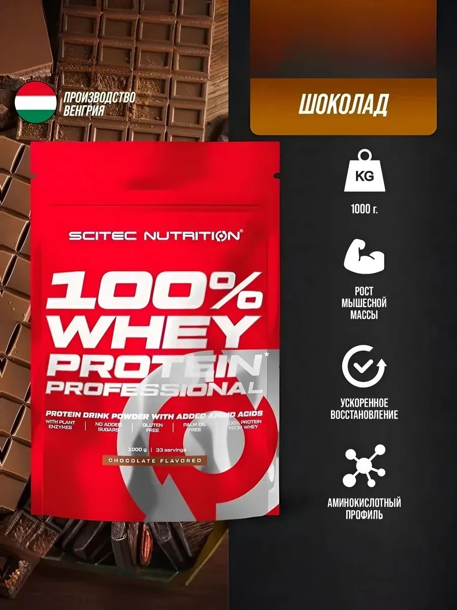 Протеин сывороточный 100% Whey Protein Professional Шоколад - это идеальное решение для тех, кто стремится поддерживать физическую форму и наращивать мышечную массу. Этот высококачественный белковый напиток содержит концентрат сывороточного протеина, который быстро усваивается, обеспечивая ваш организм всеми необходимыми аминокислотами. Продукт обогащен BCAA, в которые входят три незаменимые аминокислоты: лейцин, изолейцин и валин. Они способствуют восстановлению мышечных волокон после тренировок и помогают предотвратить распад мышечной ткани. Кроме того, Whey Protein Professional включает глютамин и аргинин, что делает его отличным выбором для тех, кто занимается силовыми тренировками. Эти компоненты поддерживают иммунную систему и улучшают кровообращение, способствуя более эффективному восстановлению и росту мышц. Приготовление этого протеина не требует много времени — достаточно смешать порцию продукта с водой или молоком, и вы получите вкусный и питательный напиток с шоколадным вкусом. Это делает его идеальным дополнением к вашему рациону, особенно в условиях активных тренировок и для тех, кто хочет контролировать свой вес. Протеин сывороточный 100% Whey Protein Professional также может быть полезен для похудения, так как он помогает поддерживать чувство сытости и уменьшает желание перекусывать между приемами пищи. Его использование в качестве перекуса обеспечит вас необходимыми белками, не добавляя лишних калорий в ваш рацион. Упаковка в 1000 грамм легко помещается в спортивной сумке или в кухонном шкафу, что делает данный продукт удобным для использования как дома, так и на ходу. Не упустите возможность сделать ваш путь к здоровому образу жизни более эффективным с помощью этого питательного и восстанавливающего протеина. Дополнительная информация: В 1 порции 30 г (в % от рекомендуемого уровня суточного потребления): Белки 22 г (29%) Углеводы 2,5 г (0,6%) в т.ч. сахар 1,8 г (2,7%) Жиры 1,8 г (2,1%). Энергетическая ценность - 484 кДж / 114 ккал (4,6%). Таурин 3,3% L-аргинин 1,7%, L-глютамин 1,7% L-лейцин 0,3% Пищеварительные ферменты: Бромелайн из ананаса 0,07% (1200 ед/г) Папаин из папайи 0,07% (1,5 ед/мг). Концентрат белка молочной сыворотки, изолят сывороточного белка Вспомогательные компоненты: Эмульгатор: соевый лецитин; обезжиренный какао порошок, ароматизатор, соль, загуститель: ксантановая камедь; подсластители: ацесульфам К, сукралоза; агент антислеживающий: диоксид кремния. Может содержать следы: молока, яйц, сои, арахиса, орехов, сельдерея, рыбы, ракообразных, моллюсков. Смешать 1 порцию порошка (30 г = 3/4 мерной ложки) с 250 мл холодной воды. Употреблять по 1 порции в день между приемами пищи. Продолжительность приема – 1 месяц. При необходимости прием можно повторить. Противопоказания: повышенная чувствительность к компонентам препарата. Не предназначен для лиц моложе 18 лет или имеющих медицинские противопоказания. Перед приемом рекомендуется проконсультироваться с врачом.
