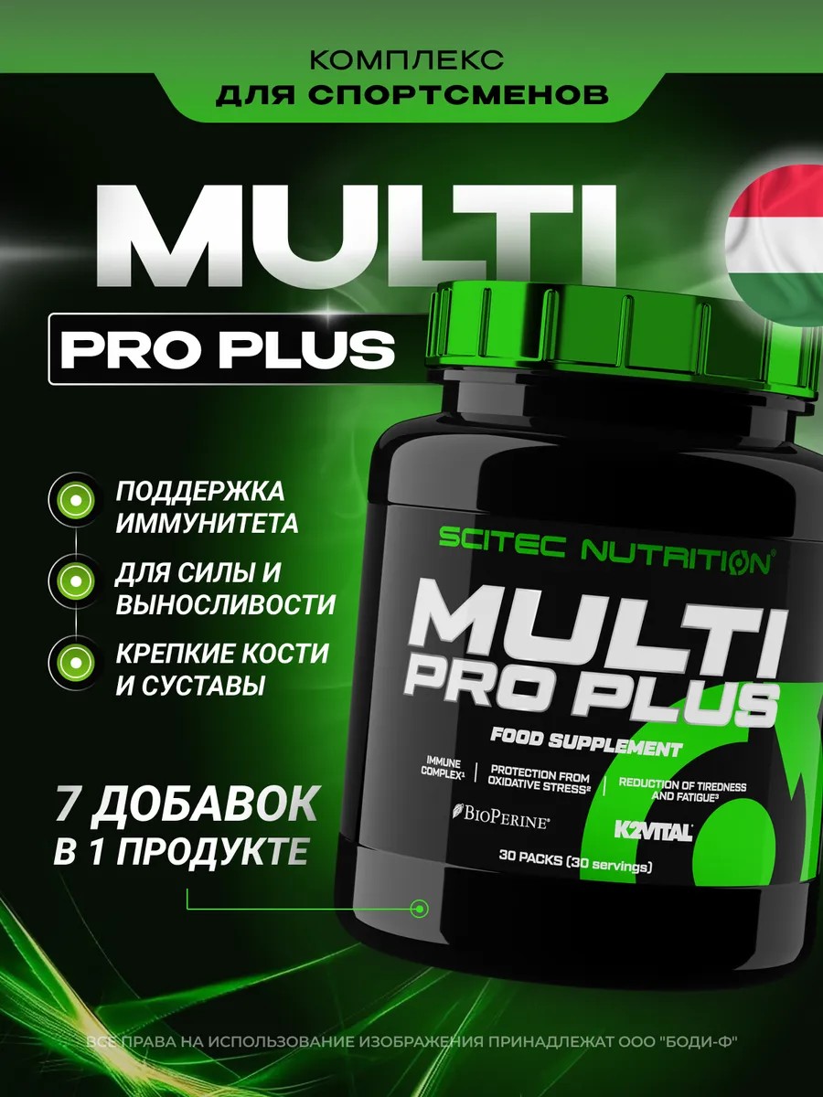 Multi Pro Plus – это мульти-витаминная и минеральная формула высокого уровня в пакетиках из нескольких таблеток/капсул, которая основывается на мульти-витаминных капсулах Mega Daily One Plus. Mega Daily One Plus – это передовая мульти-витаминная и минеральная формула, которая содержит 25 ингредиентов сама по себе (плюс дополнения в Multi Pro Plus). Эта формула предлагает высокую дозировку витаминов группы В и витамина С, плюс необходимые минералы, включая магний, селен и цинк. Витамин С способствует правильной работе иммунной и нервной систем, а также уменьшению усталости и утомляемости. Это также помогает поддерживать нормальную работу иммунной системы во время и после интенсивной тренировки (положительный эффект достигается при приеме 200 мг в день в дополнение к рекомендуемому суточному потреблению витамина С). Витамин В2 способствует поддержанию зрения и красных кровяных клеток. Фолиевая кислота способствует правильному синтезу аминокислот. Multi Pro Plus содержит 250% рекомендуемой дневной дозировки витамина D3. Витамин D способствует поддержанию работы мышечной и иммунной систем и усвоению кальция и фосфора. Цинк способствует фертильности, воспроизводству и поддержке уровня тестостерона, а также правильному обмену веществ. Магий способствует работе нервной системы: синапсы и мышечные сокращения, включая сердечную мышцу, а также синтезу белка и поддержанию здоровья костей и зубов. Селен способствует сперматогенезу, работе щитовидной железы и поддержке здоровья волос и ногтей. В Multi Pro Plus добавлены гелиевые капсулы омега-3 и лецитина, коэнзим Q10, богатый полифенолом экстракт виноградной косточки, а также усилен лютеином. SCITEC представляет витаминно-минеральный комплекс разработанный специально для атлетов испытывающих серьёзные нагрузки на тренировках и испытывающих острую потребность в повышенных дозировках ряда витаминов и минералов.