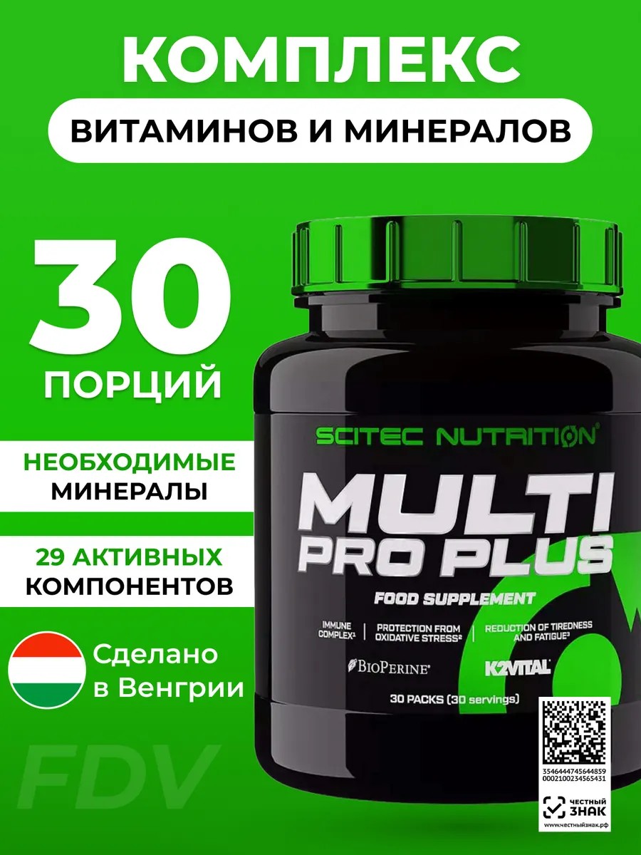 Обращаем ваше внимание, данный продукт с января 2023 выпускается без мембраны под крышкой!!! Цвет капсул белый и прозрачный. МУЛЬТИ ПРО ПЛЮС Мультивитаминная и минеральная формула высокого уровня ШИРОКИЙ РАЗНООБРАЗИЕ ВЫБРАННЫХ ИНГРЕДИЕНТОВ НЕ НУЖНО ПРИНИМАТЬ ДРУГОЕ ВИТАМИННЫЕ ДОБАВКИ ОМЕГА-3, ЛЕЦИТИН И КОЭНЗИМ Q10 С ЛЮТЕИНОМ И ЭКСТРАКТОМ ВИНОГРАДНЫХ КОСМЕЧЕК MULTI PRO PLUS — это мультивитаминная и минеральная формула высокого уровня в упаковке из нескольких капсул и таблеток на основе наших поливитаминных капсул MEGA DAILY ONE PLUS. MEGA DAILY ONE PLUS — это наша передовая мультивитаминная и минеральная формула, которая сама состоит из 25 ингредиентов (плюс дополнительные компоненты MULTI PRO PLUS)! Он содержит высокие дозы комплекса витаминов группы В и витамина С, а также необходимые минералы, включая магний, селен и цинк. Витамин С способствует нормальному функционированию иммунной и нервной систем, а также снижению утомляемости и усталости. Он также помогает поддерживать нормальную функцию иммунной системы во время и после интенсивных физических упражнений (благоприятный эффект достигается при ежедневном приеме 200 мг в дополнение к рекомендуемой суточной дозе витамина С)! Витамин B2 способствует поддержанию нормального зрения и нормальных эритроцитов. Фолат способствует нормальному синтезу аминокислот. MULTI PRO PLUS содержит 250 % питательной ценности витамина D3! Витамин D способствует поддержанию нормальной функции мышц и иммунной системы, а также нормальному усвоению/использованию кальция и фосфора. Цинк способствует нормальной фертильности, размножению и поддержанию нормального уровня тестостерона в крови, а также нормальному метаболизму макронутриентов. Магний способствует нормальному функционированию нервной системы: нейротрансмиссии и сокращению мышц, в том числе сердечной; также для нормального синтеза белка и поддержания нормальных костей и зубов. Селен способствует нормальному сперматогенезу, нормальной функции щитовидной железы и поддержанию нормального состояния волос и ногтей. MULTI PRO PLUS дополнительно содержит мягкую капсулу с омега-3 и лецитином, коэнзим Q10, экстракт виноградных косточек, богатый полифенолами, а также обогащен лютеином! *Эти заявления были научно подтверждены Европейским агентством по безопасности пищевых продуктов (EFSA) и одобрены Европейской комиссией (ЕС). Направления Принимать по 1 пакетику в день, желательно во время еды. ДОПОЛНИТЕЛЬНЫЕ ФАКТЫ Scitec Nutrition Мульти-Про Плюс Дополнительные факты: Размер порции: 1 упаковка Количество порций: 30 (30 упак.)