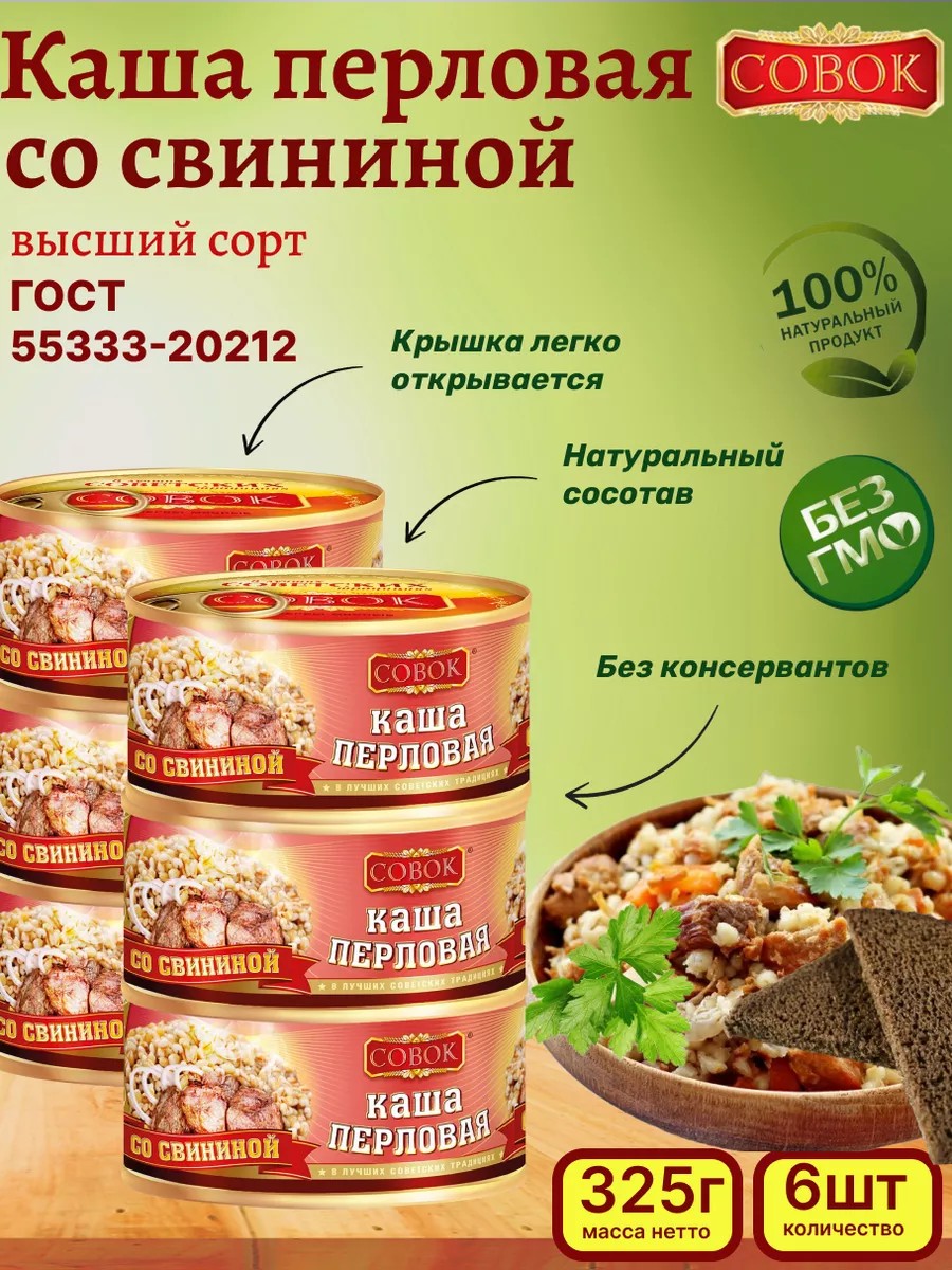 Перловая каша со свининой Совок - это натуральный продукт премиального качества, сделанный по ГОСТу. Консервы «Совок» изготавливаются только из натуральных продуктов питания - отборной свинины и перловки высшего сорта, без использования консервантов, красителей, искусственных добавок. Каша перловая консервированная не содержит ГМО. Гарантия качества, никаких подделок! Каша с мясом и перловкой - это уже сытное готовое блюдо к употреблению, которое упаковано в стерилизованные, герметичные жестяные банки, что позволяет сделать срок хранения максимально долгим. Когда нет совсем времени для готовки, правильным решением будет приобрести готовую еду с кусочками отборной свинины в консервной банке, вы не останетесь равнодушными после приемы пищи с участием нашего идеального консервированного обеда. Вкусный готовый обед / завтрак туриста выручит вас в походе, на даче, в горах, на рыбалке и поможет сэкономить время на приготовлении любимых блюд! Мясную продукцию можно взять с собой в дорогу, в длительное путешествие или просто побаловать себя по-настоящему вкусным и быстрым ужином без хлопот у плиты. Наша тушенка не только насытит вас, но и поддержат вашу энергию и силы во время активных мероприятий. В составе перловки исключительно натуральные ингредиенты высокого качества: крупа перловая, вода, свинина, животный жир, лук, перец черный, соль. Консервы из мяса - продукт быстрого приготовления, который не займет у Вас много времени. Благодаря своей надежной упаковке, вы можете наслаждаться вкусной свиной тушонкой в любое время. Готовый продукт - кашу быстрого приготовления необходимо просто разогреть (каша без варки). Закажите готовую вкусную и здоровую еду в дорогу прямо сейчас и насладитесь вкусовыми туристическими радостями на природе. Не упустите шанс попробовать наши высококачественные продукты мясной консервации и перловки. Вы можете приобрести набор банок из 3 и 6 штук.