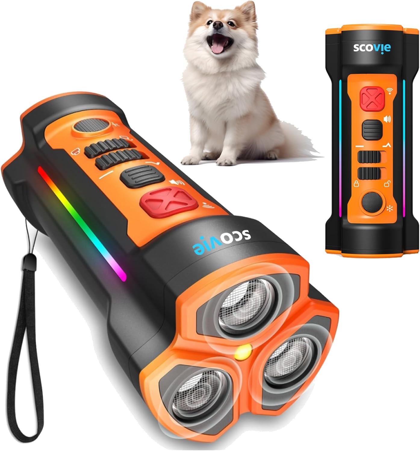 •  2.8x More Effective Stop Dog Bark Deterrent: Featuring 3x Premium Ultrasonic emitters, it can produce: 4x Chase-Stopping Sounds, 2x Bark Stopping Sonic Waves, a Very Bright Ultra Deterrent Light, or use it as a handy flashlight for evening walks. Make your training easier and more effective than ever with the SCOVIE anti barking device for dogs.