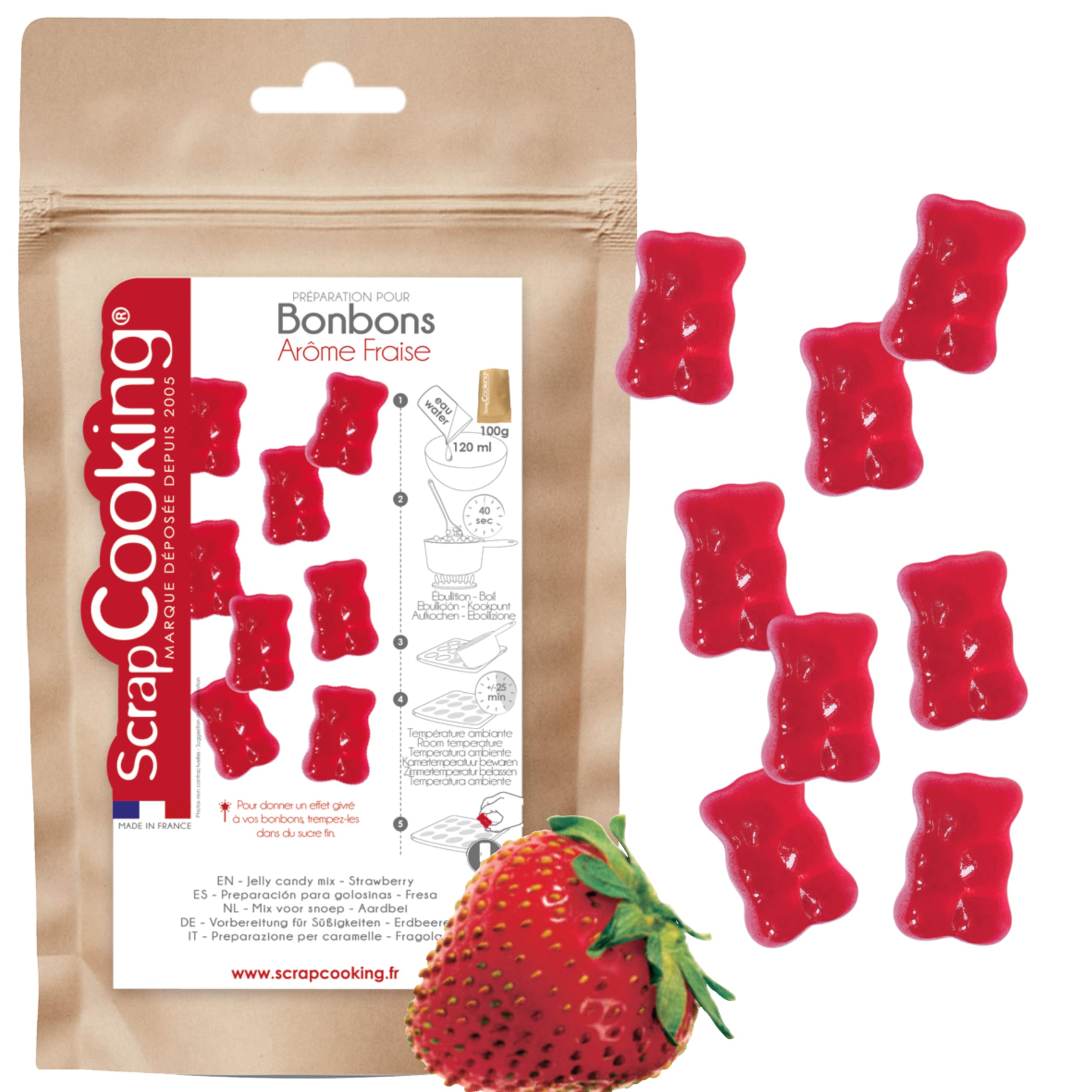 MAKE YOUR OWN HOMEMADE CANDY - A sachet of sweet mix to make delicious homemade strawberry candies. Quick and easy, you just need to add water to create your candies! NATURAL STRAWBERRY FLAVOR - This mix is made with pre-blended ingredients, including sugar, glucose syrup, gelatin, and natural strawberry flavoring. The ideal preparation for making candies with a delicious strawberry taste. EASY TO PREPARE - Making your candies is quick: pour the powder into a large bowl, add 120 ml of water, mix, then cook in a saucepan for 40 seconds at a boil. Then pour into a mold, let it rest for 25 minutes, then place in the refrigerator for 4 hours… and your candies will be ready! For a frosted effect, dip them in granulated sugar. ? DISCOVER OUR RANGE - This mix is also available in lemon flavor (ref. 8543). Want to make teddy bear-shaped candies? Opt for our teddy bear silicone mold (ref. 6733). MADE IN FRANCE - ScrapCooking is a French brand that has been designing fun and accessible products since 2005 for making and decorating homemade pastries and sweets. All of our products are conceived and largely manufactured in France, in our workshops in Fondettes (37). INGREDIENTS FR - Strawberry flavored gummy candy powder mix - Ingredients: sugar, glucose syrup, gelatin (porcine origin), natural strawberry flavoring, acidifier: citric acid, coloring: beetroot red. May contain traces of GLUTEN, EGG, SOY, PEANUTS, MILK, TREE NUTS. Average nutritional values per 100g Energy: 1553 kJ – 365 kcal Fat: 0g - of which saturates: 0g Carbohydrate: 80g - of which sugars: 74g Protein: 12g Salt: 0.03g. Net weight 100g INSTRUCTIONS FOR USE Pour the powder into a large bowl, add 120ml of water, mix, then cook in a saucepan for 40 seconds at a rolling boil. Pour into a mold, let it set for 25 minutes, then refrigerate for 4 hours. For a frosted effect, dip them in granulated sugar. See moreScrapCooking - Préparation Bonbons Fraise 100 g - Préparation Sucrée pour Réaliser Bonbon Maison - Mix pour Bonbons Oursons Gummies - Anniversaire, Enfants - Coloris Rouge - 8542DESCRIPTION DU PRODUIT DESCRIPTION DU PRODUIT CONFECTIONNEZ VOS BONBONS MAISON - Un sachet de préparation sucrée pour réaliser de délicieux bonbons maison à la fraise. Rapide et pratique, vous aurez juste à ajouter de l'eau pour créer vos bonbons ! ARÔME NATUREL DE FRAISE - Ce mix est composé d'ingrédients déjà pré-mélangés, dont du sucre, du sirop de glucose, de la gélatine et de l'arôme naturel de fraise. La préparation idéale pour réaliser des bonbons au bon goût de fraise. FACILE À PRÉPARER - La réalisation de vos bonbons est rapide : versez la poudre dans un grand bol, ajoutez 120 ml d'eau, mélangez puis faites cuire à la casserole pendant 40 secondes à ébullition. Versez ensuite dans un moule, laissez reposer 25 minutes, puis placez au réfrigérateur pendant 4 h… et vos bonbons seront prêts ! Pour donner un effet givré, trempez-les dans du sucre fin. ? DÉCOUVREZ NOTRE GAMME - Cette préparation existe également en goût citron (ref 8543). Envie de réaliser des bonbons en forme de nounours ? Optez pour notre moule silicone à bonbons oursons (ref. 6733). FABRIQUÉ EN FRANCE - ScrapCooking est une marque française qui conçoit depuis 2005 des produits ludiques et à la portée de tous pour réaliser et embellir ses pâtisseries et douceurs maison. L'ensemble de nos produits sont imaginés et en grande partie fabriqués en France, dans nos ateliers à Fondettes (37). INGRÉDIENTS FR - Préparation en poudre pour bonbons gélifiés goût fraise - Ingrédients : sucre, sirop de glucose, gélatine (origine porcine), arôme naturel de fraise, acidifiant : acide citrique, colorant : rouge de betterave. Peut contenir des traces de GLUTEN, ŒUF, SOJA, ARACHIDES, LAIT, FRUITS A COQUE. Valeurs nutritionnelles moyennes pour 100 g Valeur énergétique : 1553 kj – 365 kcal matières grasses : 0 g - dont acides gras saturés : 0 g glucides : 80 g - dont sucres : 74 g protéines : 12 g sel : 0,03 g. Poids net 100g MODE D'EMPLOI Verser la poudre dans un grand bol, ajouter 120 ml d'eau, mélanger puis faire cuire à la casserole pendant 40 secondes à ébullition. Verser ensuite dans un moule, laisser reposer 25 minutes, puis placer au réfrigérateur pendant 4 heures. Pour donner un effet givré, tremper-les dans du sucre fin. Voir plus