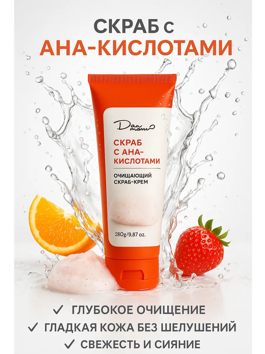 Этот крем-скраб можно назвать универсальным помощником: он сочетает функции очищающего крема, кислотного пилинга и фруктовой маски. Благодаря комплексу AHA уход становится более простым и эффективным. Скраб-крем помогает избавиться от неровностей, улучшить цвет лица и вернуть коже естественное сияние. Домашний пилинг с фруктовыми кислотами станет отличным решением для тех, кто хочет заботиться о коже профессионально, но без лишних затрат и походов в салоны.
