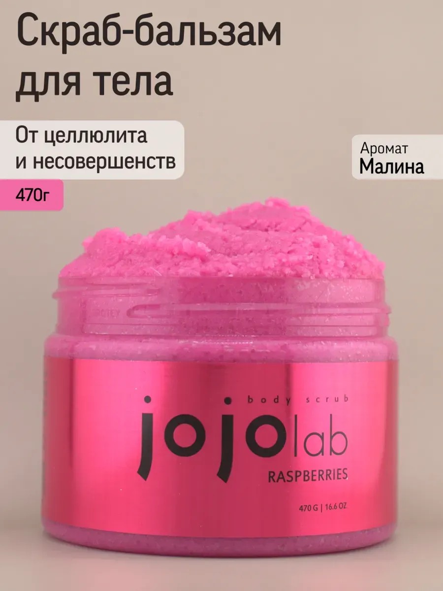 An updated salt body scrub with an unforgettable, addictive raspberry scent that lingers on your skin like a light trail. Treat yourself to a spa treatment without leaving home or take it with you on vacation or to a sauna. The balanced natural composition of this raspberry cream scrub is suitable for most skin types and makes it safe for your health. Sea salt, with its minerals and trace elements, is the foundation and main tool for your body's beauty and youth. It gently cleanses the body and exfoliates dead skin cells. It provides an anti-cellulite and firming effect, reduces swelling, and has a rejuvenating effect. With regular use, skin appears more elastic, has an even tone, and feels like silk. A complex of 6 oils enhances the effect. Coconut and sweet almond oils are a source of unique amino acids and vitamins B, A, E, and PP, necessary for hydration and accelerated cell regeneration. Grape seed and shea butter contribute to collagen synthesis, fight the signs of aging, and are a powerful natural antioxidant. Macadamia reduces inflammation and soothes irritation. The scrub's rich, balanced texture is both economical and practical! It spreads easily even over dry skin without scratching or flaking. For maximum results, prepare your body, steam it thoroughly, and massage it into the skin using circular motions. Rinse with warm water. The Jojo Lab detox scrub is a staple in bath rituals and always a welcome and useful gift for a friend or mom, whether it's New Year's, a birthday, or just Monday. Recommended for use from age 14. Package size: 9x9x8 cm, volume: 300 ml/470 g. Natural oil content: 12% of the total jar volume!
