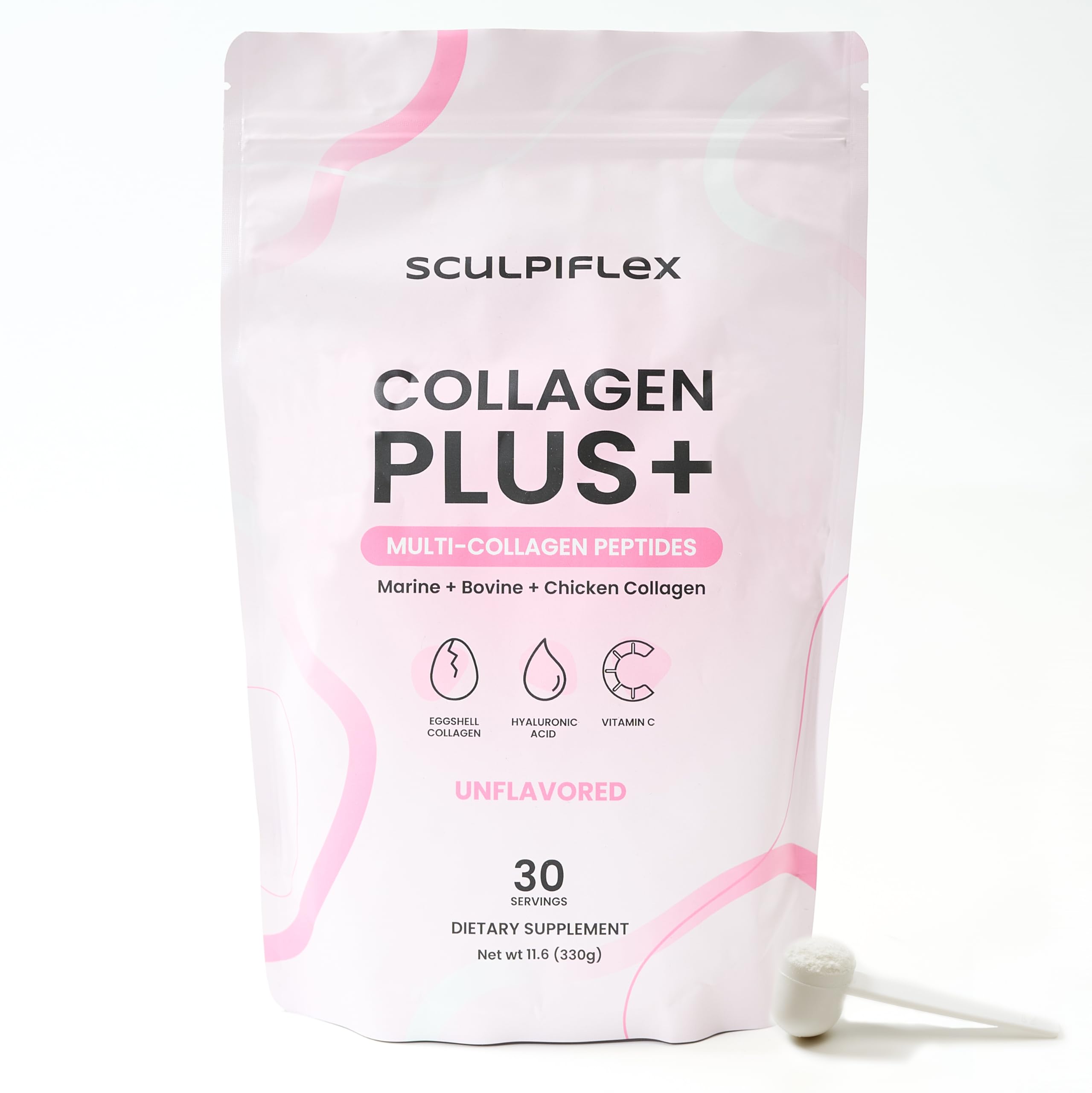 Sculpiflex Hydrolyzed Collagen Peptides Powder, Marine, Bovine, and Chicken Unflavored Multi Collagen Complex for Women, Firms Skin and Boosts Elasticity, Hydrating with Hyaluronic Acid (30 Servings)