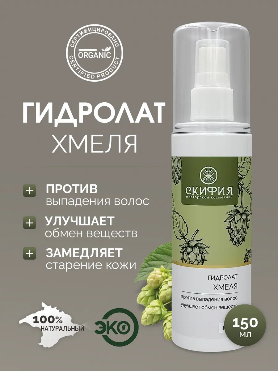 Hop hydrolate is a natural product that promotes calm and relieves nervous tension and anxiety. It has a subtle, sweet aroma of hops. This hair hydrolate is rich in vitamins (rutin, B1, B3, B6, PP) and trace elements. It is a base for making natural cosmetics at home. The spray is widely used in hair care and anti-aging products. Crimean hop water is suitable for all skin types. It is well suited for oily skin, cleansing it and closing pores. Compresses are made for acne. To do this, soak cotton pads (for applying to problem areas) or a cloth (for applying to the entire face) in the hydrolate, place them on the face, and leave for 10-15 minutes. It can also be used as cosmetic ice to tighten the skin and tighten pores. To combat dandruff and excess oiliness, spray the hydrolate onto a dry scalp. Using our facial mist, you will preserve the beauty and radiance of your hair and skin!