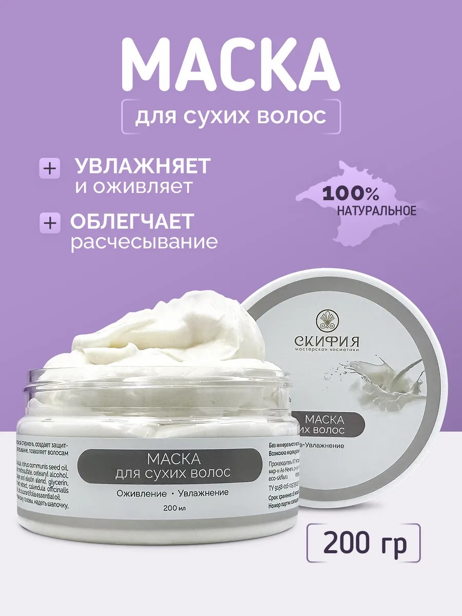 Маска для сухих волос натуральная тм Скифия подарит блеск и сияние Вашим волосам. В результате частых химических завивок, окраски, обесцвечивания, использования горячих приборов: фена, утюжка, плойки и т.д., злоупотребления укладочными средствами волосы становятся сухими, тусклыми, изможденными, ломкими. При этом происходит недостаточное выделения кожного сала, сухие пряди не блестят, их тяжело расчесывать, они легко спутываются. В этом случае нужно волосы дополнительно увлажнить, восстановить, насытить необходимыми веществами.
