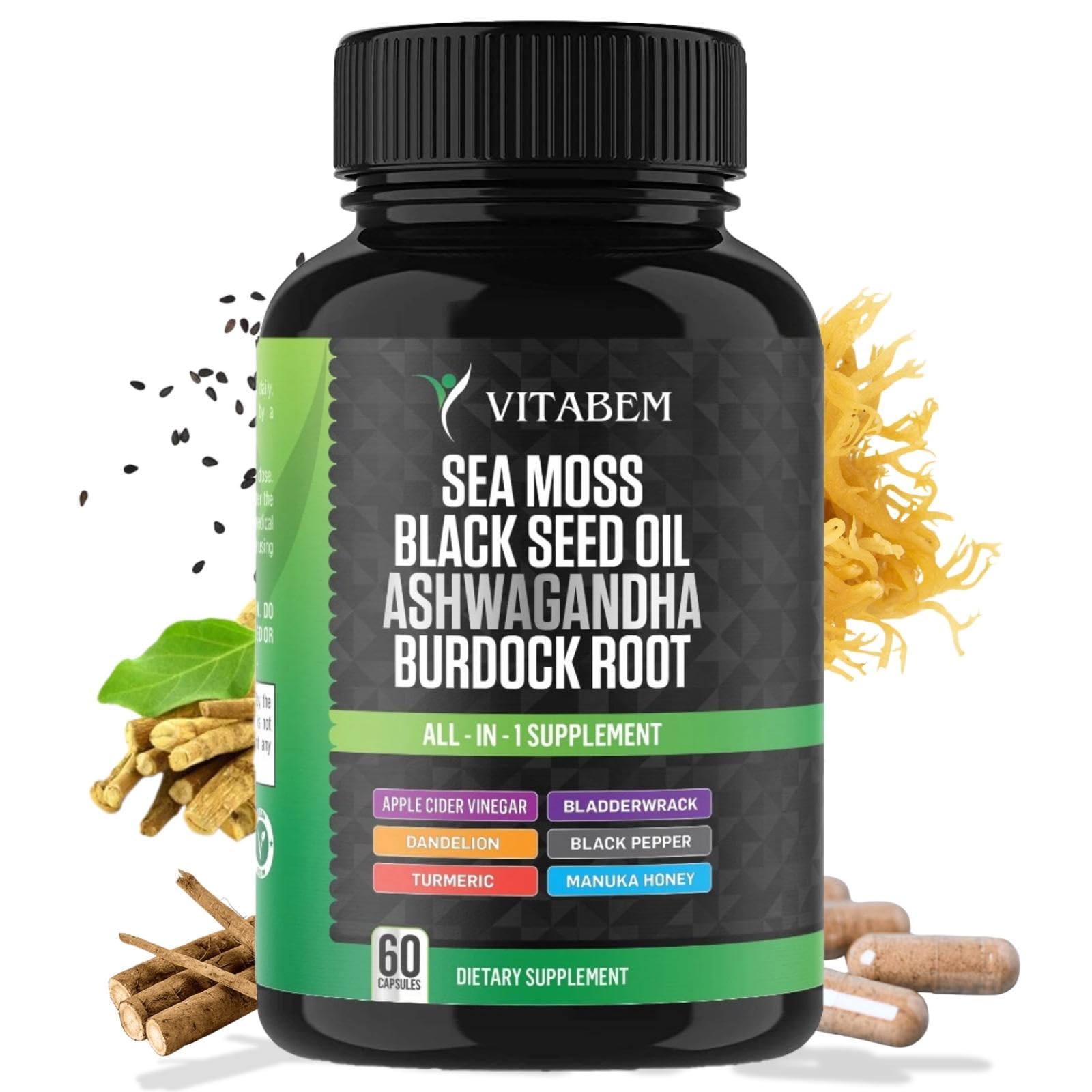 Sea Moss Black Seed Oil Ashwagandha Burdock Root Bladderwrack Apple Cider Vinegar Turmeric Manuka Honey Dandelion Black Peppersea moss, sea moss capsules, sea moss black seed oil ashwagandha ginger, seamoss black seed oil ashwagandha burdock root, seamoss pills, bladderwrack, burdock root capsules. Trusted Third-Party Validation: Our Sea Moss All-in-1 Supplement undergoes rigorous 3rd party lab testing in USA, confirming its premium quality, free from contaminants, and delivering the pure essence of sea moss. Rest assured that our seamoss capsules and ashwagandha supplements are meticulously formulated in a registered and certified facility right here in the USA. With our products, you won't find any unnecessary preservatives or fillers. Packed with a potent blend of Sea Moss Supplement, Black Seed Oil capsules, Ashwagandha capsules, Burdock Root, Bladderwrack and Turmeric powder, it offers an abundance of benefits. Say goodbye to the clutter of countless supplements in your cabinet and make room for a single solution. A groundbreaking All-in-1 formula, combining Seamoss powder, Black Seed Oil, Ashwagandha capsules, and Burdock supplement. The perfect combination of Raw Sea Moss and Black Seed Oil Capsules. Our blend offers 7 beneficial ingredients in a single dosage. Experience the power of Irish Sea Moss Powder, Black Seed, Ashwagandha, Bladderwrack, and Burdock Root all conveniently packed into just one capsule. Finally, the convenience you've been waiting for—Irish sea moss wildcrafted, black seed, ashwagandha powder, all in one easy-to-take solution. Our advanced formula of Irish Sea Moss Capsules are designed for both women and men. Our Seamoss Pills, enriched with Black Seed Oil for hair health, contain a remarkable blend of beneficial ingredients, including Turmeric Curcumin Capsules, Bladderwrack capsules, Burdock roots and more. Featuring raw sea moss, black seed, ashwagandha extract, bladderwrack root, burdock roots and turmeric capsules. A comprehensive combination of Sea Moss Pills, Black Seed Oil Pills, Ashwagandha, Bladderwrack, and Burdock Root Capsules, enriched with potent ingredients. Experience the power of Turmeric Curcumin, Apple Cider Vinegar, Manuka Honey and more in one convenient formula. These sea moss bladderwrack burdock root capsules provide a great alternative to sea moss gummies, black seed oil gummies, and ashwagandha gummies.