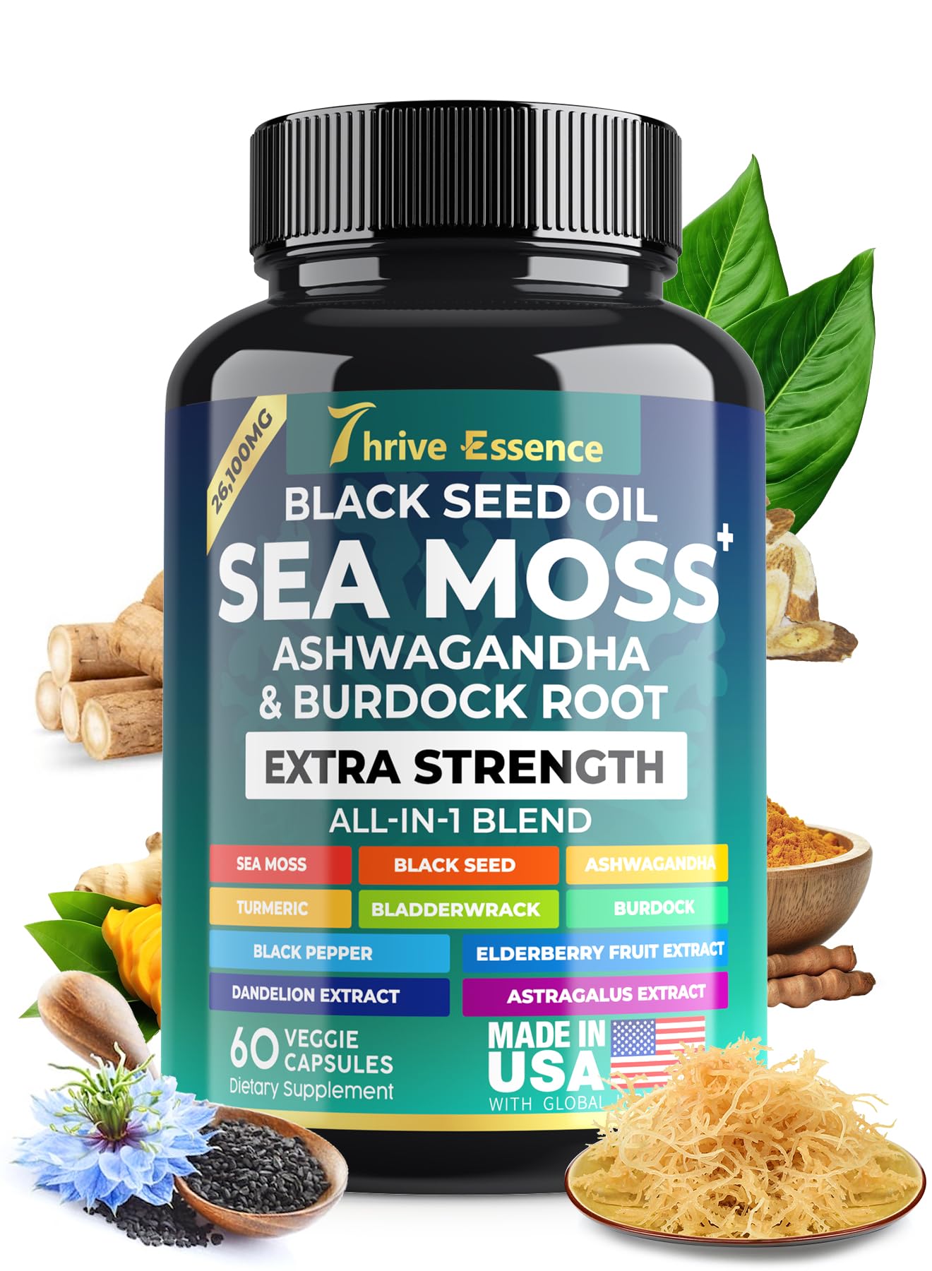 Our Promise Trusted Ingredients – Thrive Essence Sea Moss All-in-1 Supplement is meticulously crafted in a certified USA facility, undergoing rigorous third-party lab testing to ensure exceptional quality and purity. Our clean-label formula contains no unnecessary preservatives or fillers, delivering high-quality sea moss in its most beneficial form. Designed for optimal absorption, our capsules provide a premium supplement experience you can trust. Perfect for Your Diet and Wellness Goals – Our sea moss supplement is designed to fit various dietary needs, including vegetarian, vegan, gluten-free, and low-carb lifestyles. It's an excellent choice for those following keto diets or with gluten sensitivities. Plus, our formula includes black pepper extract to enhance bioavailability, ensuring your body absorbs nutrients efficiently. Potent Nutrients in Every Capsule – Experience the benefits of our Sea Moss Extract, Black Seed Oil, and Ashwagandha in every serving. These nutrient-rich ingredients are known for their potential to support immune function, promote vitality, and help maintain natural energy levels. 10-in-1 Super Formula – Thrive Essence's 10-in-1 supplement combines Sea Moss, Black Seed Oil, Ashwagandha, Bladderwrack, Burdock Root, and more into one convenient capsule. Simplify your supplement routine with this comprehensive health solution—ditch multiple bottles and enjoy the ease of a single, well-balanced formula. Designed to support overall health and well-being, Thrive Essence helps you stay on top of your wellness goals. Powerful Sea Moss Capsules for Women and Men – Thrive Essence offers an all-in-one supplement with a potent blend of Sea Moss Extract, Black Seed Oil, Ashwagandha, Bladderwrack, Burdock Root, Turmeric Curcumin, Black Pepper, Elderberry Fruit, and Dandelion. This comprehensive formula provides extensive nutritional support, ensuring you get essential nutrients for your well-being.