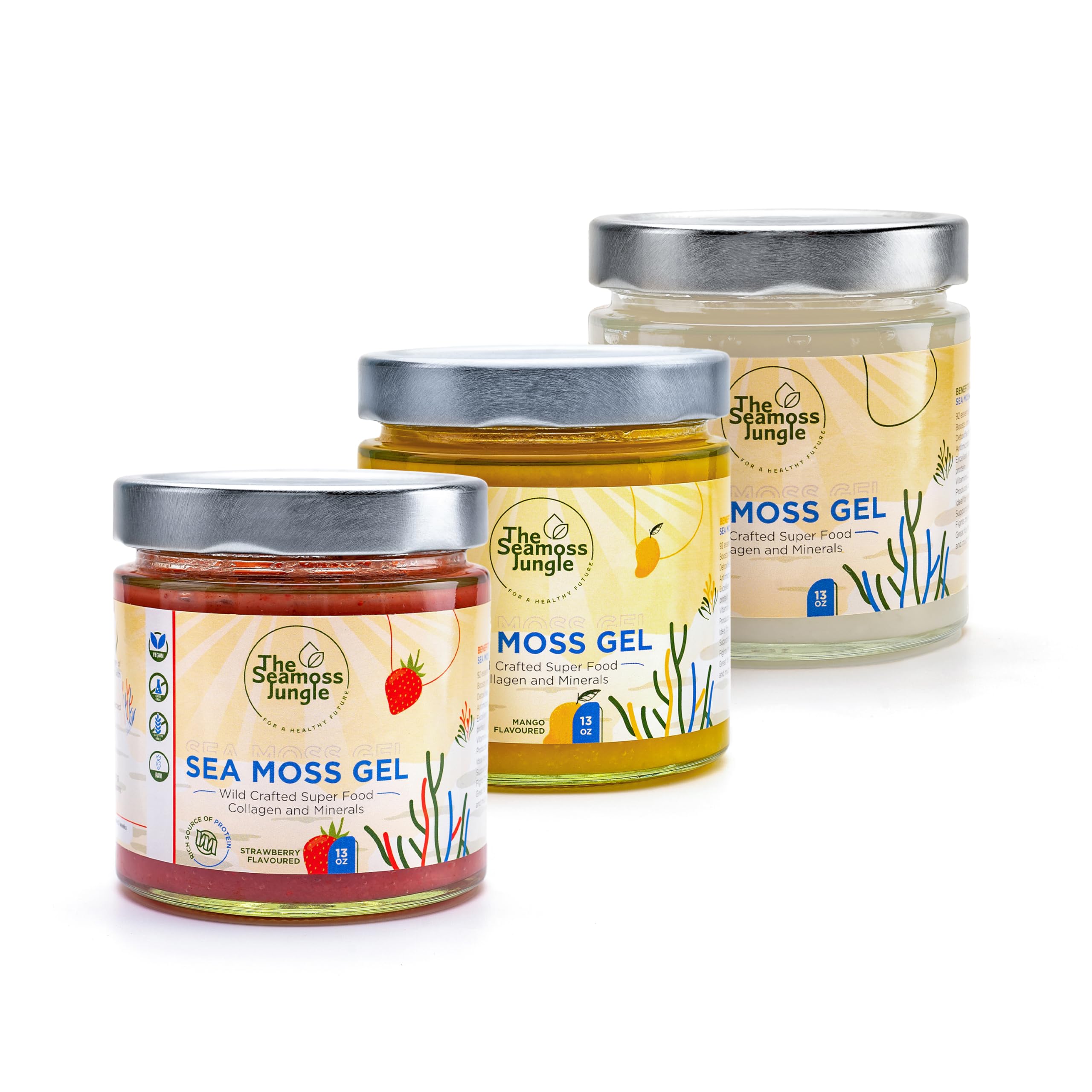 Discover the Sea Moss Family Pack Discover health, flavor and diversity with the Sea Moss Family Pack. Featuring three delicious gels – Plain, Mango and Strawberry – this set offers the perfect combination of nutrition and versatility to support your daily well-being. What does the pack contain? Sea Moss Nature Gel (390 ml): Pure and neutral in taste, ideal for smoothies or as a natural food supplement. Sea Moss Mango Gel (390 ml): Sweet and tropical, perfect for smoothies, snacks or desserts. Sea Moss Strawberry Gel (390 ml): Fruity and refreshing, ideal for breakfast, desserts or to consume as is. Why choose the Family Pack? Variety Economy: Three flavors in one affordable set. Pure Natural: No artificial additives or preservatives. Versatile: Perfect for smoothies, dishes or to consume directly. Long Lasting: Keeps up to 3 weeks in the refrigerator or 4 months in the freezer. The health benefits of Sea Moss Immune system: Strengthens natural defenses. Energy: Provides a daily boost of energy. Digestion: Promotes intestinal health and regularity. Perfect for all lifestyles Whether you're discovering Sea Moss for the first time or exploring new flavors, the Family Pack is your ideal choice for health and pleasure. Order now and enjoy the benefits of Sea Moss with every spoonful!Shelf-Stable: Stays fresh for up to 3 weeks in the refrigerator or can be frozen for up to 4 months – always ready to use when you need it. Simple Versatile: Add 1-2 tablespoons to smoothies, shakes, or meals – or enjoy it straight from the jar as a nutritious snack. Mineral-Rich Superfood: Contains 92 essential minerals to support your health, energy, and overall well-being. Sustainably Harvested: Hand-picked from the pristine waters of St. Lucia, with a commitment to the highest quality and respect for marine ecosystems. Delicious Variety: Enjoy three unique flavors – Plain, Mango, and Strawberry – perfect for smoothies, snacks, desserts, or straight from the spoon. Natural Pure: Made with 100 natural ingredients, with no artificial additives or preservatives – for a healthy, balanced diet. Découvrez le Pack Famille Sea Moss Découvrez santé, saveur et diversité avec le Pack Famille Sea Moss. Composé de trois gels délicieux – Nature, Mangue et Fraise – cet ensemble offre la combinaison parfaite de nutrition et de polyvalence pour soutenir votre bien-être au quotidien. Que contient le pack ? Gel Sea Moss Nature (390 ml) : Pur et neutre en goût, idéal pour les smoothies ou comme complément alimentaire naturel. Gel Sea Moss Mangue (390 ml) : Sucré et tropical, parfait pour les smoothies, collations ou desserts. Gel Sea Moss Fraise (390 ml) : Fruité et rafraîchissant, idéal pour le petit-déjeuner, les desserts ou à consommer tel quel. Pourquoi choisir le Pack Famille ? Variété Économie : Trois saveurs dans un set abordable. Pur Naturel : Sans additifs artificiels ni conservateurs. Polyvalent : Parfait pour les smoothies, plats ou à consommer directement. Longue Durée : Se conserve jusqu'à 3 semaines au réfrigérateur ou 4 mois au congélateur. Les bienfaits santé du Sea Moss Système immunitaire : Renforce les défenses naturelles. Énergie : Apporte un boost quotidien d'énergie. Digestion : Favorise la santé intestinale et la régularité. Parfait pour tous les styles de vie Que vous découvriez le Sea Moss pour la première fois ou exploriez de nouvelles saveurs, le Pack Famille est votre choix idéal pour la santé et le plaisir. Commandez dès maintenant et profitez des bienfaits du Sea Moss à chaque cuillère !Longue conservation : Reste frais jusqu'à 3 semaines au réfrigérateur ou peut être congelé jusqu'à 4 mois – toujours prêt à l'emploi quand vous en avez besoin. Simple Polyvalent : Ajoutez 1 à 2 cuillères à soupe à vos smoothies, shakes ou plats – ou savourez-le directement comme une collation nutritive à même le pot. Superaliment riche en minéraux : Contient 92 minéraux essentiels pour soutenir votre santé, votre énergie et votre bien-être général. Récolté de manière durable : Cueilli à la main dans les eaux cristallines de Sainte-Lucie, avec un engagement envers la plus haute qualité et le respect des écosystèmes marins. Délicieuse diversité : Savourez trois saveurs uniques – Nature, Mangue et Fraise – parfaites pour les smoothies, collations, desserts ou à déguster directement à la cuillère. Naturel Pur : Fabriqué à partir d'ingrédients 100 naturels, sans additifs artificiels ni conservateurs – pour une alimentation saine et équilibrée.