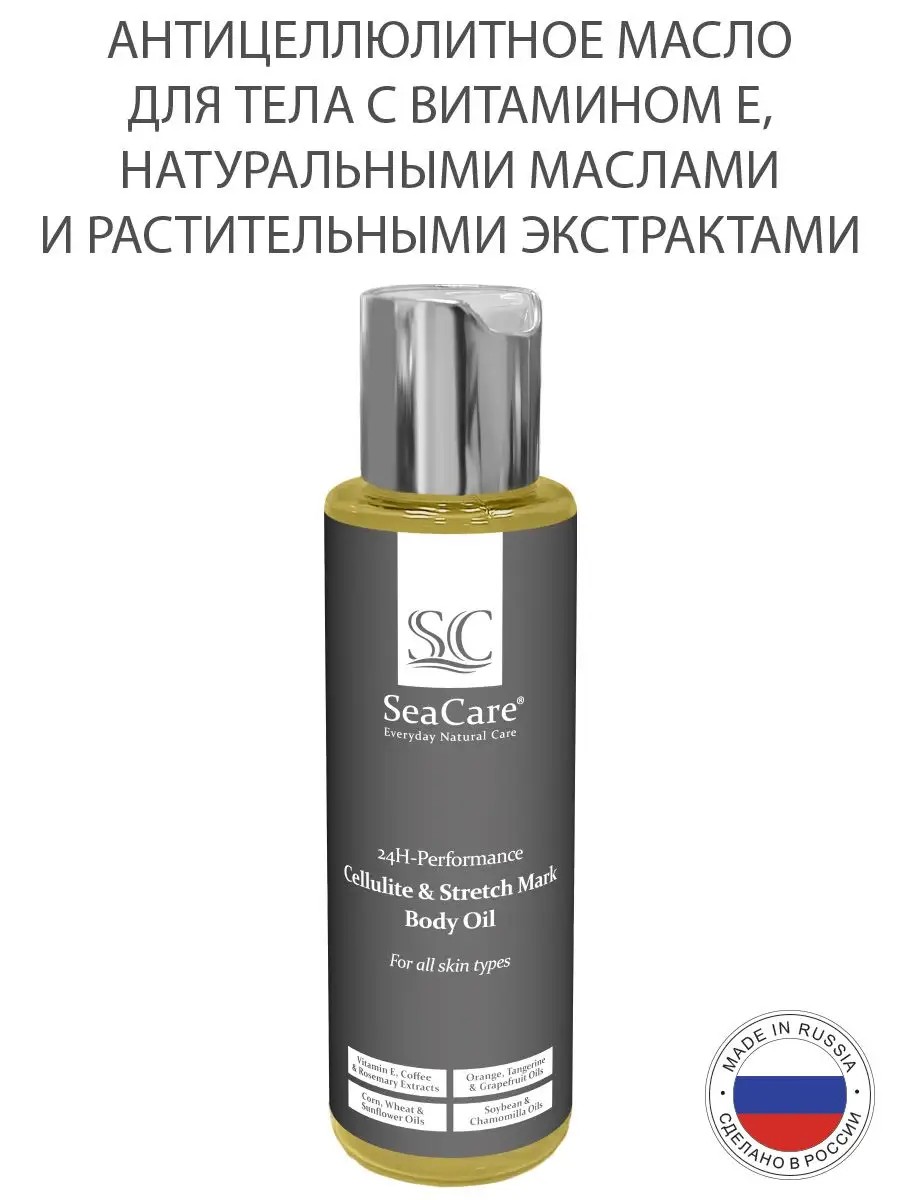 SeaCare 24H-Performance Anti-Cellulite Body Oil is an exceptionally enriched product containing a carefully selected combination of vitamins and natural ingredients. Light in texture and quickly absorbed, the oil formula is enriched with Vitamin E, a natural powerful antioxidant that nourishes the skin, helps prevent damage from UV radiation, and protects the skin from damage caused by free radicals, which play a large role in the aging process. The oil contains Soybean Oil, helps strengthen the skin's moisture barrier and provides antioxidant protection for the skin, restores collagen and improves skin elasticity; Coffee Extract, a powerful antioxidant that provides protection against skin damage, reduces the appearance of cellulite on the skin; Orange Oil, has toning properties for the skin, fights cellulite and helps keep the skin elastic; Wheat Extract, a skin emollient that provides optimal care for sensitive or damaged skin; Sunflower Seed Oil acts as an emollient that retains moisture and keeps the skin well hydrated; Corn Seed Oil keeps the epidermis hydrated, restores the skin's lipid barrier, and soothes irritation; Rosemary Extract reduces skin puffiness, improves circulation, and promotes skin metabolism; Chamomile Extract relieves inflammation and soothes itchy, irritated skin, restores skin elasticity, and reduces the appearance of dry, flaky skin; Mandarin Oil reduces acne, brightens skin, and regulates oiliness; and Grapefruit Oil contains natural alpha hydroxy acids (AHAs), which promote smoothing and rejuvenation of the skin by increasing the rate of cell turnover. Daily use of this oil will help reduce the appearance of cellulite and stretch marks, rejuvenate the skin, making it softer, smoother, and more velvety.