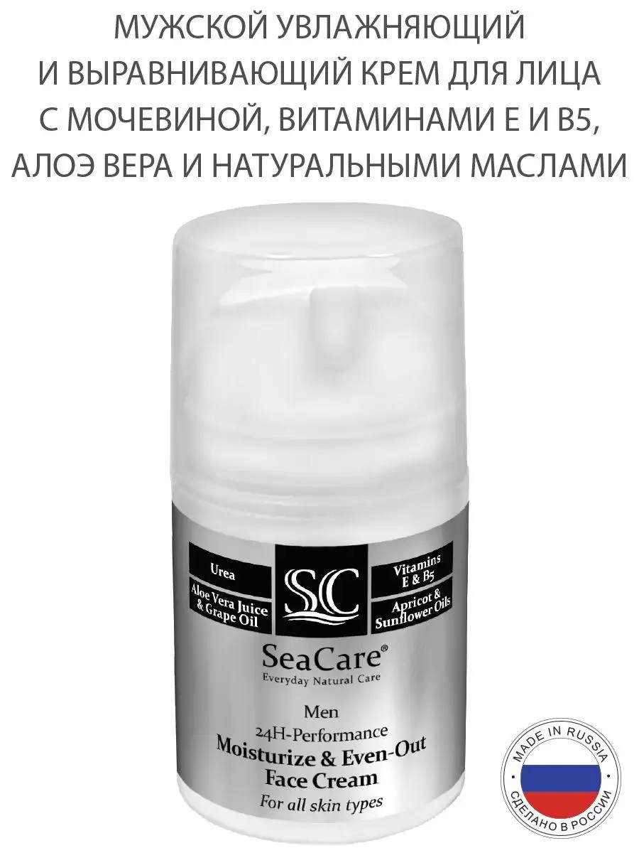 SeaCare 24H-Performance Увлажняющий и Выравнивающий Крем для Лица для Мужчин специально разработан для ежедневного ухода за мужской кожей. SeaCare 24H-Performance Мужской Увлажняющий и Выравнивающий Крем для Лица разработан для того, чтобы улучшить цвет и состояние кожи и придать ей яркость и гладкость. Легкая по текстуре и быстро впитывающаяся, формула крема обогащена Мочевиной, мощным увлажняющим ингредиентом, который обеспечивает превосходное увлажнение и эластичность кожи. Обладая мощными увлажняющими свойствами, Мочевина может удерживать влагу в коже, сохраняя внешний слой кожи увлажненным и сбалансированным в его наиболее здоровом состоянии. Крем содержит Витамин Е, натуральный мощный антиоксидант, который питает кожу, помогает предотвратить ущерб от ультрафиолетового излучения, и защищает кожу от повреждений, вызванных свободными радикалами, которые играют большую роль в процессе старения; и Витамин В5, отличный увлажняющий ингредиент, который уменьшает трансэпидермальную потерю воды, быстро увлажняет кожу, придавая ей более эластичный вид. В состав также входят Сок Алоэ Вера, натуральный ингредиент, который обладает множеством преимуществ и подходит для всех типов кожи, особенно для сухой, поврежденной, ломкой, чувствительной и раздраженной, обладает антиоксидантными, увлажняющими, успокаивающими и противозудными свойствами для кожи; Масло Винограда, ускоряет обновление клеток и синтез коллагена, что помогает коже оставаться эластичной и здоровой; Абрикосовое Масло, питает кожу, уменьшая появление тонких линий и морщин, улучшает цвет кожи и придает ей сияние; и Масло Подсолнечника, действует, как смягчающее средство, которое удерживает влагу и сохраняет кожу хорошо увлажненной. Ежедневное использование этого крема поможет увлажнить кожу и выровнять ее тон, уменьшить проявление микроморщин и замедлить признаки старения кожи.