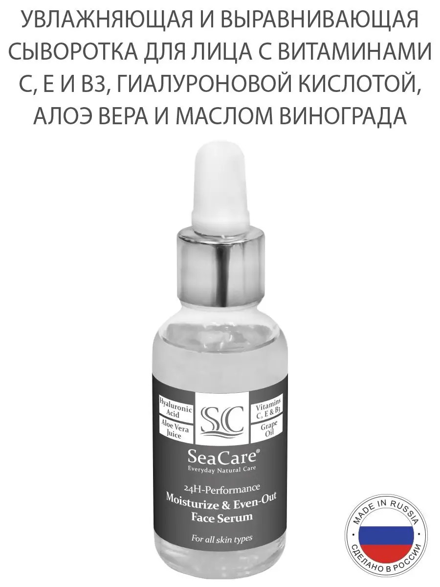SeaCare 24H-Performance Увлажняющая и Выравнивающая Сыворотка для Лица разработана для того, чтобы улучшить цвет и состояние кожи и придать ей яркость и гладкость. Легкая по текстуре и быстро впитывающаяся, формула сыворотки обогащена Витаминами С и Е, мощными антиоксидантами, которые борются со свободными радикалами и защищают кожу от воздействия окружающей среды, предотвращая преждевременное старение. Витамины С и Е увеличивают выработку аминокислот в коже, ускоряя обновление клеток кожи и стимулируя выработку коллагена, благодаря чему кожа становится более гладкой и упругой; и Витамином В3, мощным ингредиентом для выравнивания тона, увлажнения и омоложения кожи. Витамин В3 - важное питательное вещество, которое уменьшает трансэпидермальную потерю воды (TEWL), способствует укреплению гидролипидного барьера кожи и улучшает её внешний вид. Сыворотка содержит Гиалуроновую кислоту, повышает уровень упругости, разглаживает мелкие морщинки, поддерживает синтез коллагена, а также сохраняет влагу в коже, способствуя антивозрастным омолаживающим эффектам. В состав также входят Сок Алоэ Вера, натуральный ингредиент, который обладает множеством преимуществ и подходит для всех типов кожи, особенно для сухой, поврежденной, ломкой, чувствительной и раздраженной, обладает антиоксидантными, увлажняющими, успокаивающими и противозудными свойствами для кожи; и Масло Винограда, ускоряет обновление клеток и синтез коллагена, что помогает коже оставаться эластичной и здоровой. Ежедневное использование этой сыворотки поможет увлажнить кожу и выровнять ее тон, уменьшить проявление микроморщин и замедлить признаки старения кожи.