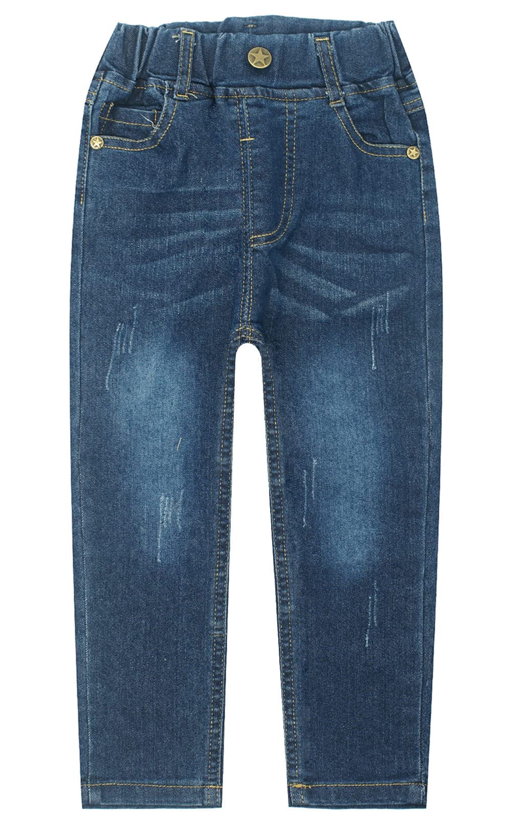 • The elastic waistband design of pull-on blue jeans is convenient for kids to wear and take off.