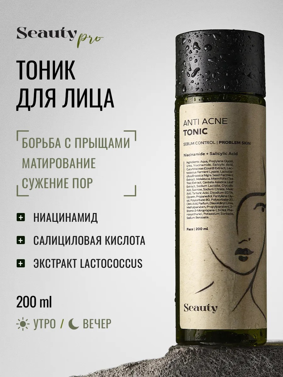 Тоник для ухода за проблемной кожей лица Seauty станет незаменимым элементом в вашем ежедневном ритуале красоты. Тонер для лица предназначен для всех, кто мечтает о свежем, чистом и гладком лице без следов акне и черных точек. Красивая здоровая кожа без фильтров.