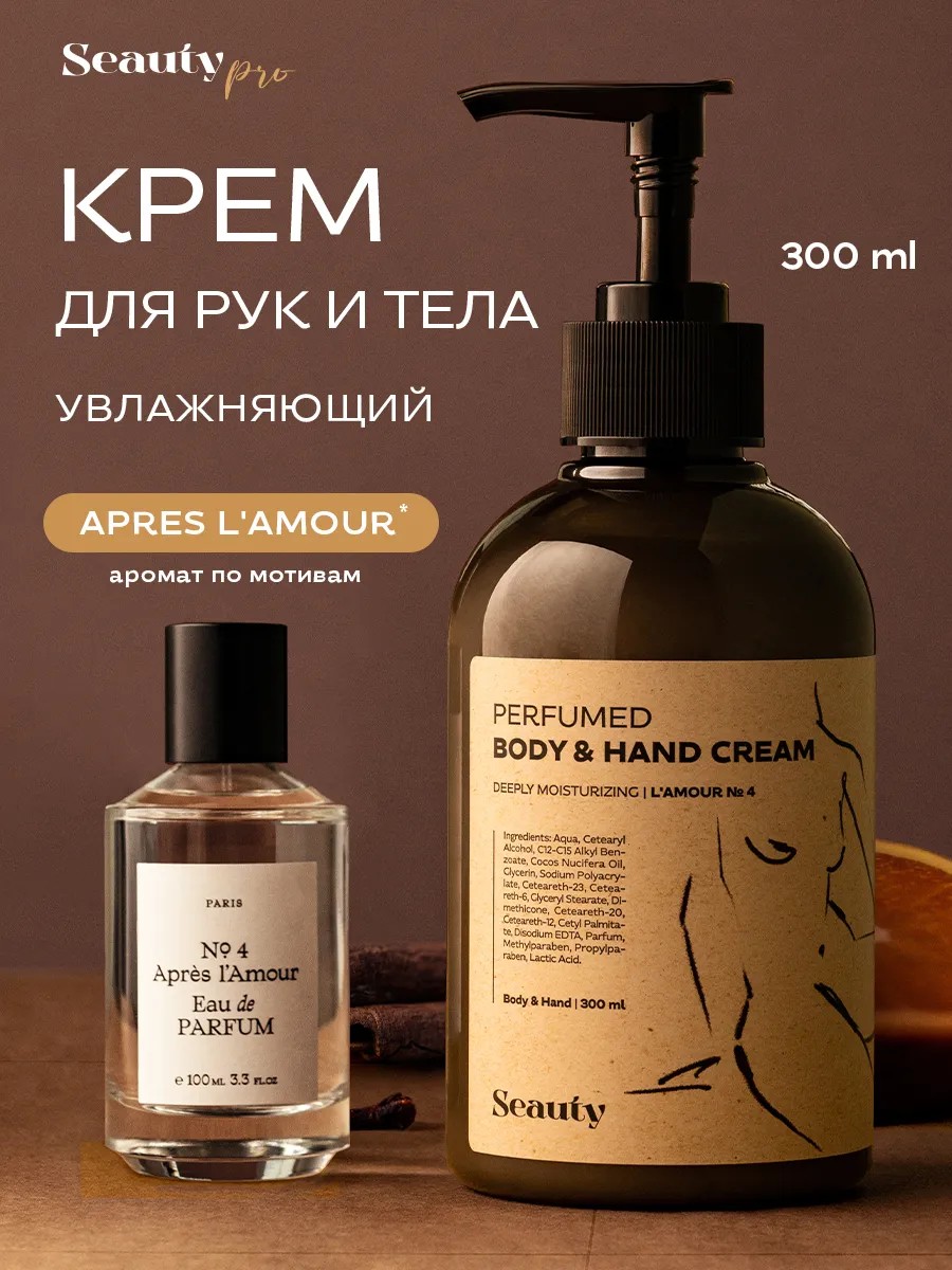 Уникальный парфюмированный крем для тела Seauty – это уходовое средство с натуральным и гипоаллергенным составом. Мускусная магия с древесными нотами в свежести цитруса и пудровом переливе пряности окутает вашу кожу на длительное время. Изысканные шлейф APRES L'AMOUR № 4 будет с вами на протяжение всего дня. Питательный крем обогащен маслом кокоса и молочной кислотой. Кокосовое масло глубоко питает и смягчает кожу, предотвращая появление шелушений и микротрещин. Молочная кислота восстанавливает эластичность и поддерживает тонус кожи. Нежная текстура подарит коже стойкий аромат любимого парфюма. Увлажняющий уход за руками, ногами и пяточками обеспечивает питание и защиту вашей кожи в холодный период от мороза. Поможет смягчить кожу, придавая ей здоровый и ухоженный вид. Подходит для всех типов кожи: нормальной и проблемной, чувствительной и комбинированной, сухой и жирной.