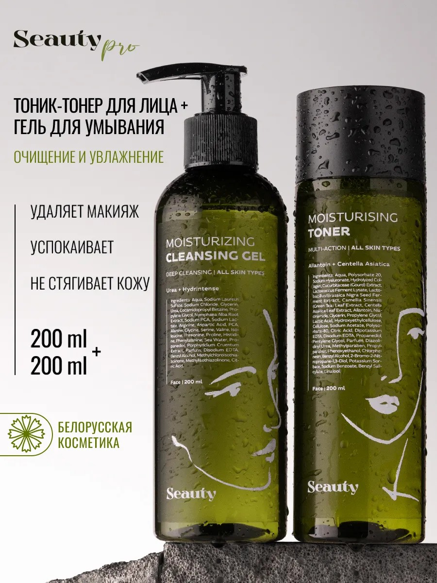Набор уходовой косметики для бережного очищения и глубокого увлажнения: увлажняющий тонер-тоник для лица и очищающий гель от известного белорусского бренда Seauty. В составе тоника натуральные компоненты для эффективного ухода и увлажнения. Аллантоин стимулирует обновление клеток. Гидролизованный коллаген и ниацинамид в формуле тонера для умывания улучшают эластичность кожи и выравнивают тон. Тоник для лица очищающий с collagen обогащен экстрактом центеллы азиатской, который обеспечивает мощное лимфодренажное действие, а экстракт зеленого чая тонизирует и очищает поры. Гель для умывания лица имеет натуральный состав. Комплекс Hydrintense интенсивно увлажняет. Мочевина мгновенно справляется с сухостью и шелушениями, активизируя естественные процессы регенерации кожи. Экстракт водной лилии глубоко очищает поры и снижает воспаления. Аминокислотный комплекс восстанавливает защитный барьер.