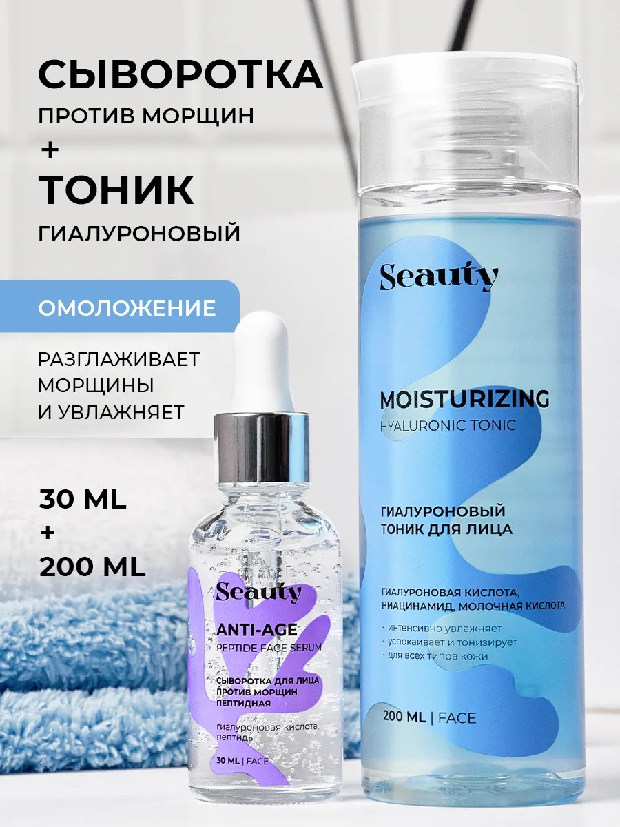 Гиалуроновый кислотный тоник + омолаживающая сыворотка с пептидами – это эффективная система ухода, которая увлажняет и восстанавливает. Пептидная сыворотка для лица от морщин способствует естественной выработке гиалуроновой кислоты, эластина, коллагена collagen, повышает упругость кожи, разглаживает морщины и замедляет процесс старения. Пептиды обновляют и восстанавливают клетки. Тоник для лица очищающий интенсивно увлажняет и помогает восстановить рН-баланс. Гиалуроновая кислота – мощный антиоксидант, насыщает кожу освежающей влагой, повышает ее упругость и эластичность, делает ее гладкой, увлажненной и сияющей. Ниацинамид поддерживает баланс влаги, наполняет клетки кожи энергией, уменьшает признаки усталости, возвращая коже здоровый вид и ровный тон. Молочная кислота мягко и бережно отшелушивает ороговевший слой эпидермиса, поддерживая необходимый уровень увлажненности кожи. Белорусская косметика Сьюти подходит как для взрослых, так и для подростков. Профессиональная антивозрастная косметика с гиалуроновой кислотой делает кожу увлажненной и сияющей.Натуральный состав, профессиональный уход, корейская(Корея) технология для разного типа кожи: жирной и сухой, проблемной и комбинированной, нормальной и возрастной, а также чувствительной. Вы можете также собрать подарочный набор в подарок для женщин, мужчин или подростка: средство от черных точек (угрей), акне и от прыщей для подростков, умывалка для умывания (умывашка для лица), база для макияжа алоэ алое вера aloe vera, крем пантенол для кожи вокруг глаз, маска церамиды, гель для душа и ванны (уход за телом), сывортка для роста бровей и ресниц. Набор белорусской косметики для лица и тела Seauty – это отличный подарок жене и маме, подруге и сестре, любимой девушке. Seauty – это белорусская профессиональная уходовая косметика для подростков и взрослых. We are vegan!