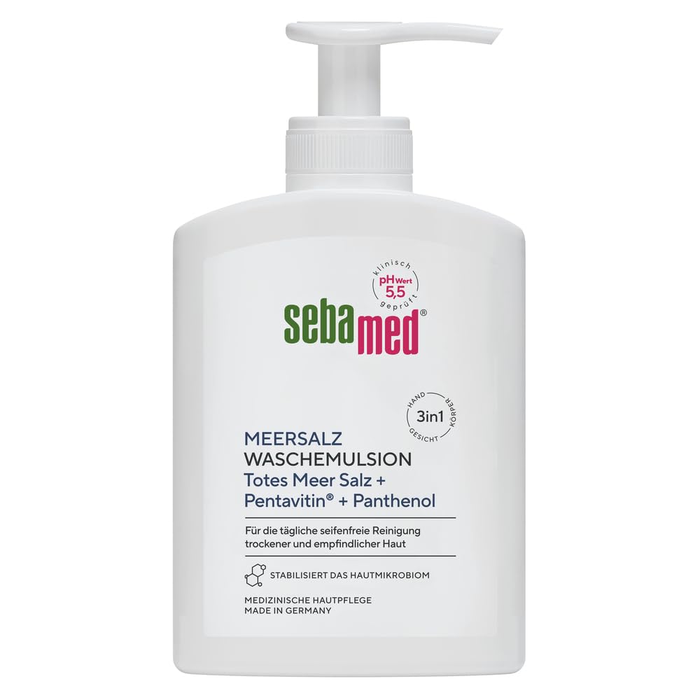 The new Sebamed Sea Salt Cleansing Emulsion provides particularly gentle cleansing for dry and sensitive skin and combats dehydration. A unique Dead Sea salt-based complex combined with panthenol works to combat oiliness, dryness, and skin irritation. Furthermore, its pH of 5.5 supports the skin's natural protective barrier and makes it more resilient. This new product from Sebamed is ideal for daily soap-free cleansing, and a convenient, metered pump dispenser ensures hygienic product dispensing. The Sebamed Sea Salt product line is distinguished by its 3 Dead Sea salt content. Sea salt, with its soothing and regenerative properties, is known to improve skin tone over time. The new Sebamed Sea Salt Cleansing Emulsion provides particularly gentle cleansing for dry and sensitive skin and combats dehydration. A complex of Dead Sea salt combined with panthenol helps prevent skin from becoming oily, dry, and irritated. Furthermore, its pH of 5.5 supports the skin's natural protective barrier and makes it more resilient. Like all Sebamed products, the Sebamed Sea Salt Cleansing Emulsion is free of microplastics, mineral oils, and parabens. This new product from Sebamed is ideal for daily, soap-free cleansing. Let yourself be convinced by the new sea salt cleansing emulsion. INGREDIENTS Aqua, Lauryl Glucoside, Sodium C14-16 Olefin Sulfonate, Maris Sal, Panthenol, Glycerin, Phenoxyethanol, Parfum, Sodium Benzoate, Allantoin, Citric Acid, Sorbic Acid, Saccharide Isomerate, o-Cymen-5-ol, Tetramethyl Acetyloctahydronaphthalenes, Sodium Citrate DIRECTIONS For daily cleansing of dry skin without soap. Apply sparingly to damp skin. For cleansing hands, face, and body. SAFETY WARNING Not applicable See moreOur environmental promise: 0 microplastics, 0 silicone, 0 PEGs, vegan. Clinically and dermatologically tested: Our range of products for sensitive skin helps stabilize the skin's natural protective barrier and make it more resistant to environmental stimuli. All components have been carefully selected. Tolerance and skincare benefits are dermatologically and clinically tested. Thanks to its skin-friendly pH of 5.5, this skincare line helps significantly reduce the risk of skin reactions. Quality made in Germany: Our products are designed, tested, and manufactured in Germany. Quality is guaranteed by selected raw materials and controlled manufacturing processes. Sebamed products are dermatologically and clinically tested in over 400 studies. For healthy skin: Sebamed's pH of 5.5 strengthens the function of the skin's natural protective barrier against harmful environmental aggressors for a healthy scalp and strong hair. Medical skincare. With original Dead Sea salt: The special feature of the Sebamed Sea Salt product line is its 3 Dead Sea salt content. Sea salt, with its soothing and regenerating properties, is known to improve skin tone over time. Particularly gentle cleansing: Sebamed Sea Salt Cleansing Emulsion provides particularly gentle cleansing for dry and sensitive skin and combats dehydration. A care complex based on original Dead Sea salt, combined with panthenol and pentavitin, helps prevent oiliness, dryness, and skin irritation. Suitable for hands, face, and body.SEBAMED Émulsion lavante au sel de mer 200 ml pour un nettoyage particulièrement doux des peaux sèches et sensibles, lutte contre la déshydratation, avec des minéraux d'origine de la mer MorteDESCRIPTION DU PRODUIT DESCRIPTION DU PRODUIT La nouvelle émulsion de lavage au sel de mer Sebamed assure un nettoyage particulièrement doux des peaux sèches et sensibles et lutte contre la déshydratation. Un complexe de soin à base de sel de la mer Morte original associé au panthénol agit contre le dégraissage, le dessèchement et l'irritation de la peau. En outre, le pH 5,5 soutient le manteau de protection naturel de la peau et rend la peau plus résistante. La nouveauté de Sebamed est idéale pour le nettoyage quotidien de la peau sans savon et un distributeur à pompe pratique et dosable assure un retrait hygiénique du produit. La particularité de la ligne de produits Sebamed sel de mer est sa teneur en 3 de sel de la mer Morte. Le sel de mer avec ses propriétés apaisantes et régénérantes est connu pour améliorer durablement le teint de la peau. La nouvelle émulsion lavante au sel de mer Sebamed assure un nettoyage particulièrement doux des peaux sèches et sensibles et lutte contre la déshydratation. Un complexe de soin à base de sel de la mer Morte d'origine associé au panthénol aide à prévenir le dégraissage, le dessèchement et l'irritation de la peau. En outre, le pH 5,5 soutient le manteau de protection naturel de la peau et rend la peau plus résistante. Comme tous les produits Sebamed l'émulsion de lavage au sel de mer Sebamed est exempte de microplastiques, d'huiles minérales et de parabens. La nouveauté de Sebamed est idéale pour le nettoyage quotidien de la peau sans savon. Laissez-vous convaincre par la nouvelle émulsion de lavage au sel de mer. INGRÉDIENTS Aqua, Lauryl Glucoside, Sodium C14-16 Olefin Sulfonate, Maris Sal, Panthénol, Glycerin, Phenoxyethanol, Parfum, Sodium Benzoate, Allantoin, Citric Acid, Sorbic Acid, Saccharide Isomerate, o-Cymen-5-ol, Tetramethyl Acetyloctahydronaphthalenes, Sodium um Citrate MODE D'EMPLOI Pour le nettoyage quotidien des peaux sèches sans savon. Appliquer avec parcimonie sur la peau humidifiée. Pour le nettoyage des mains, du visage et du corps AVERTISSEMENT DE SÉCURITÉ Non applicable Voir plusNotre promesse environnementale : 0 microplastique 0 silicone 0 PEG VEGAN. CONFIRMÉ DERMATOLOGIQUEMENT CLINIQUEMENT : notre gamme de produits pour peaux sensibles aide à stabiliser le manteau protecteur naturel de la peau et à rendre la peau plus résistante aux stimuli environnementaux. Tous les composants ont été soigneusement sélectionnés. La tolérance et l'effet de soin sont testés dermatologiquement et cliniquement. Grâce à son pH doux po