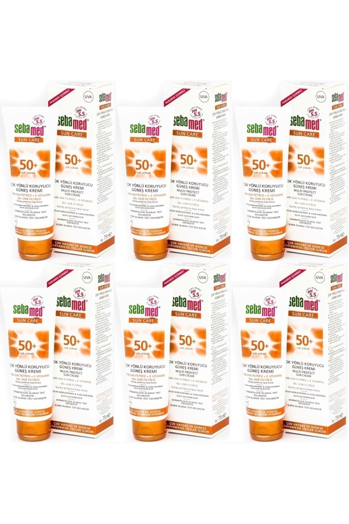 Sebamed Sun Care Versatile Protective Sun Cream 75ML SPF 50 Factor (Set of 6)Features:It provides reliable UVA UVB protection with its effective UVA UVB filter system combined with micro pigments that prevent skin damage and irritation due to sun rays.It has a pH value of 5.5.Protects the skin against the effects of aging.It softens and smoothes the skin exposed to the sun and preserves the skin's elasticity.Provides protection against pigmentation spots caused by the sun and signs of premature aging.It remains resistant to water and sweat for up to 6 hours and is resistant to sand.It is easy to apply, does not contain oil and does not leave a white residue.Natural Hydro Fructol formula contains vitamin E, d-panthenol.Protects the skin against sunburn.It protects the skin against sun damage and aging.Suitable for children with very sensitive skin and skin that is not resistant to the sun.It is suitable for use on the beach, while doing sports and in the city.Dermatologically and clinically tested.It does not contain paraben.Sebamed Versatile Protective Sun Lotion 50 Factor 150 mlComponents: Aqua, Octocrylene, Dibutyl Adipate, Titanium Dioxide (Nano), C12-15 Alkyl Benzoate, Butyl Methoxydibenzoylmethane, Glycerin, DiethylaminoHydroxybenzoyl Hexyl Benzoate, Dimethicone, VP Eicosene Copolymer, Microcrystalline Cellulose, Panthenol, Tocopheryl Acetate, Lauryl Glucoside, Polyglyceryl-2 Dipolyhydroxystearate, Diethylhexyl Butamido Triazone, Inulin, Lecithin, Bisabolol, Sodium Cetearyl Sulfate, Silica, Bis-Ethylhexyloxyphenol Methoxyphenyl Triazine, Cellulose Gum, Xanthan Gum, Disodium EDTA, Citric Acid, Sodium Hydroxide, Parfum, Benzyl Alcohol, Dehydroacetic Acid, Ethylhexylglycerin, Phenoxyethanol, Sorbic Acid.