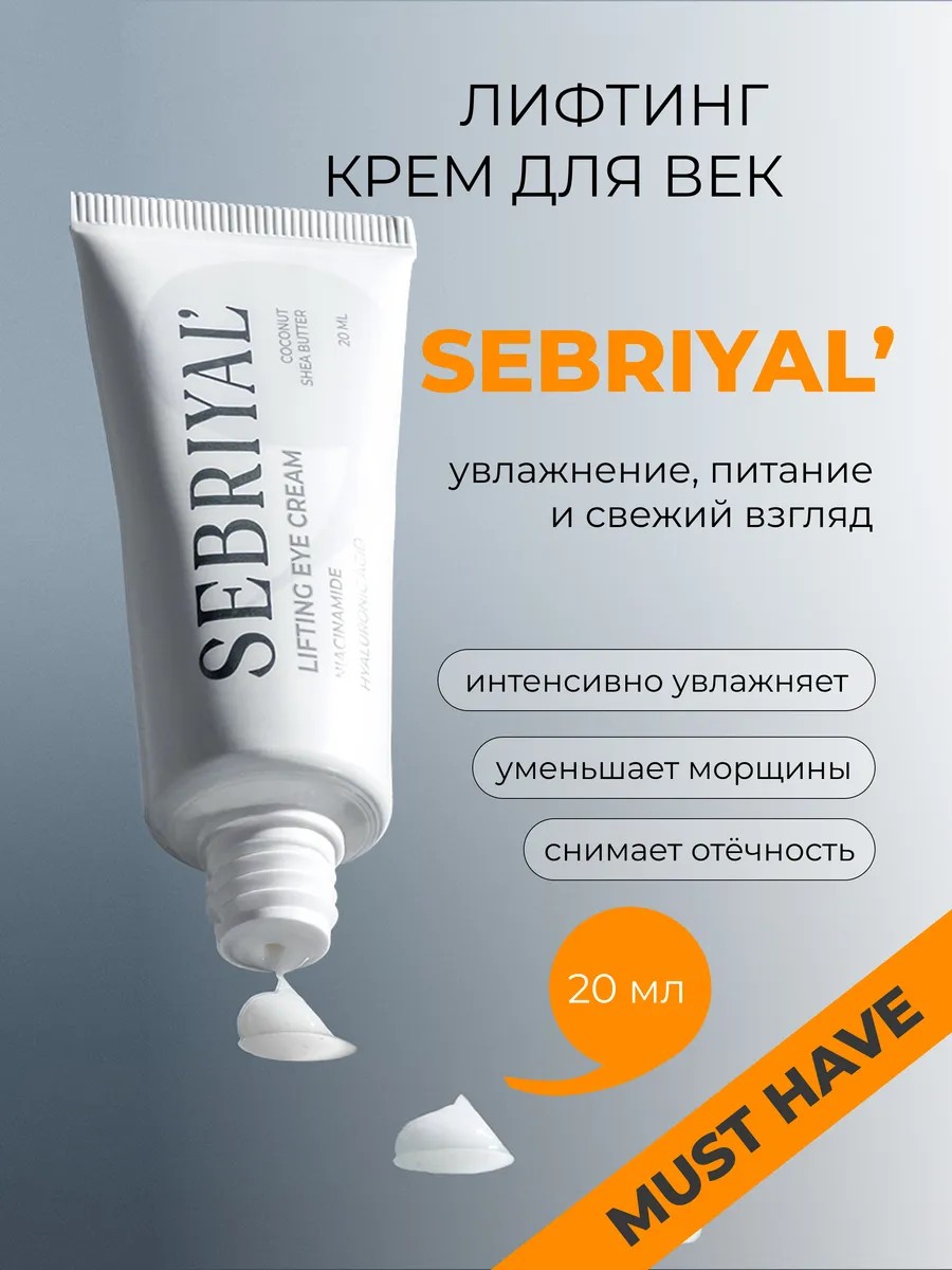 This eye cream with a complex of active ingredients for gentle care is a cosmetic product designed to eliminate signs of fatigue and combat the first signs of aging. This care product from SEBRIYAL contains niacinamide, caffeine, and hyaluronic acid, which effectively reduce the appearance of puffiness, dark circles, and bruises, restoring freshness and radiance to the eyes. This complex product also contains hydrolyzed silk and amino acids, which are beneficial for strengthening the skin, promoting its smoothness and elasticity. Coconut oil and shea butter deeply nourish and moisturize, preventing dryness and irritation. Vitamin E and panthenol protect the delicate eye area from harmful environmental factors, promote regeneration, and improve the skin's texture. Chamomile extract soothes and reduces inflammation, providing gentle care for even the most sensitive skin. This care product has a light texture and is easy to apply. This nourishing cream absorbs quickly and leaves no stickiness, making it ideal for morning and evening use. Suitable for all skin types, including oily, dry, and combination skin, it maintains youth and beauty. It's chosen for its active hydration, restoration, and rejuvenating effect by both adults and young women who notice the first signs of aging and choose effective skincare products to combat them. SEBRIYAL eye cream is a useful purchase and a great gift for mom or grandma, whether for Women's Day or just any occasion, or a sweet token of affection for a sister or friend. The product comes in a 20 ml tube, sealed in protective packaging to protect it during delivery. We have special offers and sales, so you can purchase our products as gifts at a discount!