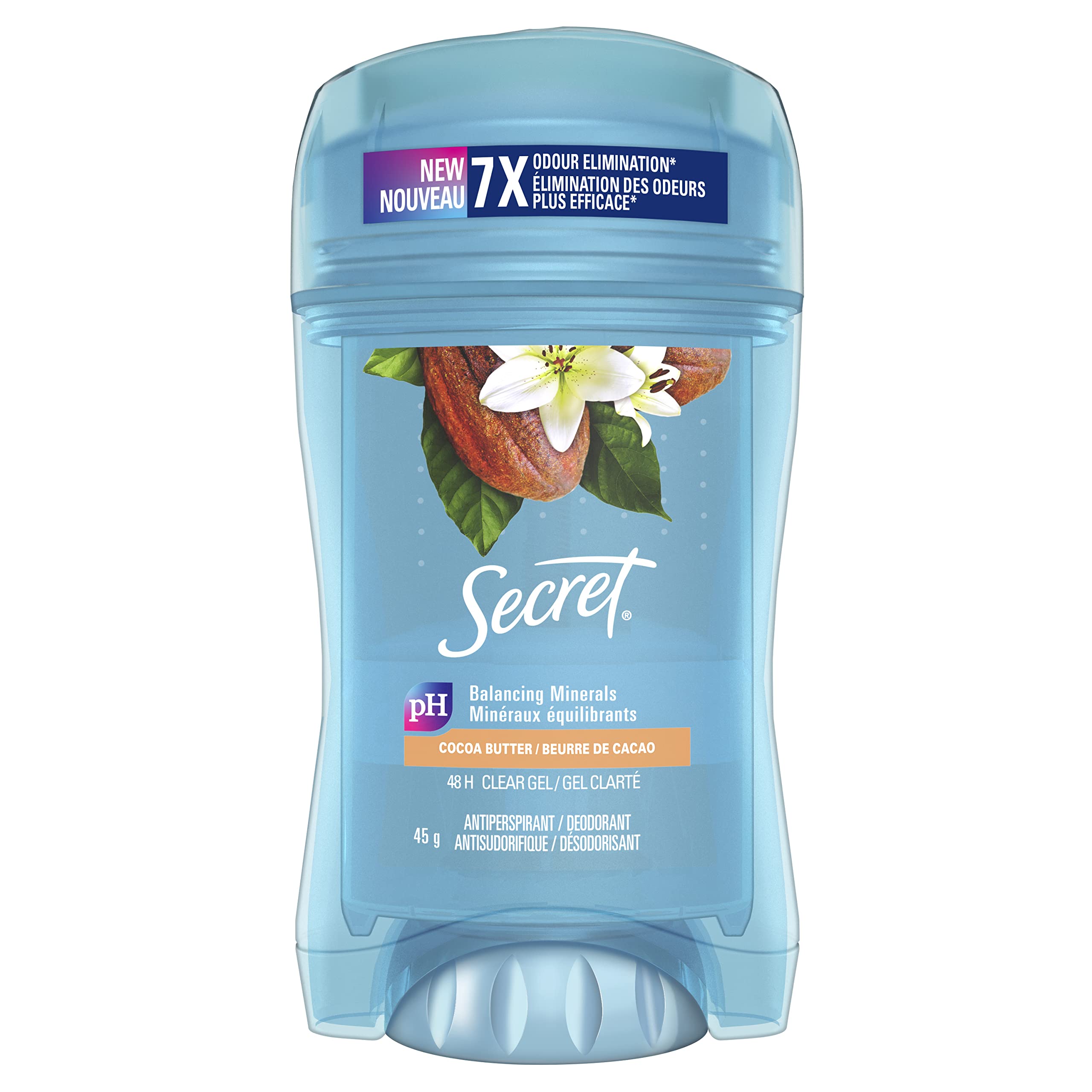 Designed with scents that last, the Secret Fresh Collection has scents you love from our former Scent Expressions and Destinations collections, now with scent-enhancing technology. Secret Clear Gel goes on clear, dries quickly, and helps eliminate odors with 48-hour odor control and wetness protection. Discover unstoppable freshness with Secret Clear Gel. This relaxing cocoa butter scent was previously called Classic Cocoa Butter.Stay dry, odor-free, and unstoppably fresh with Cocoa Butter Secret Clear Gel Antiperspirant and Deodorant. Helps eliminate odors. Sweat and odor are no match for its 48 hours of odor control and wetness protection. Ditch the white marks on your clothes with clear gel that goes on clear and dries fast. Stay unstoppably fresh all day long and lather your senses in the creamy, nutty aroma of Cocoa Butter Secret Clear Gel Antiperspirant and Deodorant.