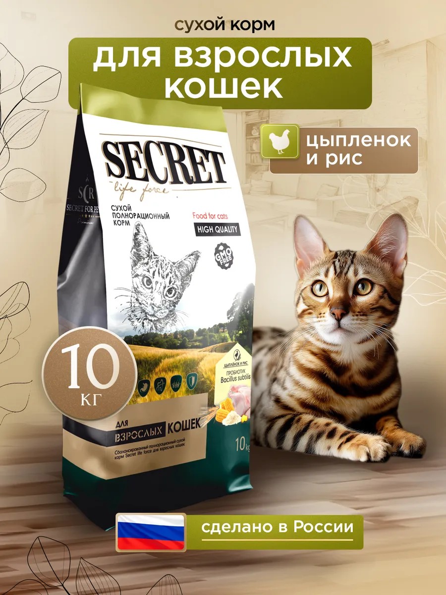 Secret Life Force dry cat food with chicken and rice flavor is a specially balanced, complete premium food designed to support cats' health throughout their lives. This dry cat food recipe is based on the secrets to longevity, discovered through studying the unique needs of pets. This highly palatable cat food contains vitamins A, D, E, and B vitamins, omega-3 and omega-6 fatty acids, and mineral supplements to provide all the necessary nutrients for the daily diet. An innovative addition to Secret food is the natural probiotic Bacillus subtilis, which helps optimize digestion and support immunity, as well as Yucca schidigera extract, which reduces unpleasant odor in urine and feces. The optimal kibble size and density promote gentle cleaning of teeth and maintain healthy gums. High-quality proteins maintain your cat's energy levels. A balance of Omega-3 and Omega-6 fatty acids ensures healthy skin and coat. A combination of vitamins and taurine supports immunity. Each kibble is 8 mm in size. Visit our KZVS store, where you'll find a wide selection of pet supplies.