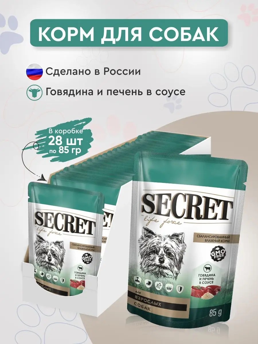 Secret Life Force Premium Wet Dog Food with Beef and Liver, Chunks in Sauce, 28 Pieces x 85g. Secret wet dog food is a nutritious canned diet made with real meat, the foundation of a healthy pet's diet. This liquid food contains only natural and balanced ingredients, making it easy for your pet to digest. This canned food does not contain harmful additives or flavor enhancers and is non-addictive. This dog food is made from natural Russian meat.