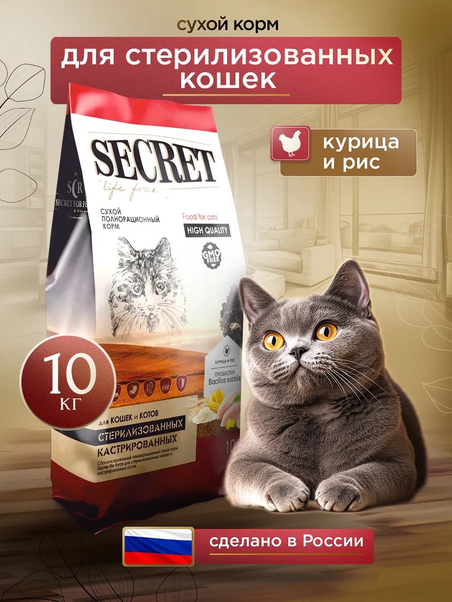 Корм сухой Secret Premium для стерилизованных кошек и кастрированных котов с курицей и рисом — это специальный сбалансированный полнорационный корм разработан с учетом особенностей физиологии стерилизованных животных. Содержание белка и жира скорректировано для поддержания оптимального веса питомца. В основе рецепта кошачьего корма лежат секреты долголетия, раскрытые в процессе изучения особых потребностей питомцев. Корм для кошек и котов имеет высокие вкусовые качества, в его состав включены витамины: А, D, E и группы В, жирные кислоты, Омега-3 и Омега-6, минеральные добавки, которые обеспечивают суточную потребность животного во всех питательных веществах. Инновационным решением корма секрет стало добавление натурального пробиотика Bacillus subtilis, способствующего оптимизации пищеварения и поддержке иммунитета кота и кошки, а также экстракта Юкки Шидигера, который снижает неприятный запах мочи и фекалий. Оптимальный размер и плотность гранул способствует бережной чистке зубов и сохранению здоровья десен. Баланс жирных кислот Омега-3 и Омега-6 обеспечивает здоровую кожу и шерсть. Сочетание комплекса витаминов и таурина поддерживают иммунитет. Размер гранулы - 10 мм. Переходите в наш магазин КЗВС, там Вы найдете большой ассортимент зоотоваров.