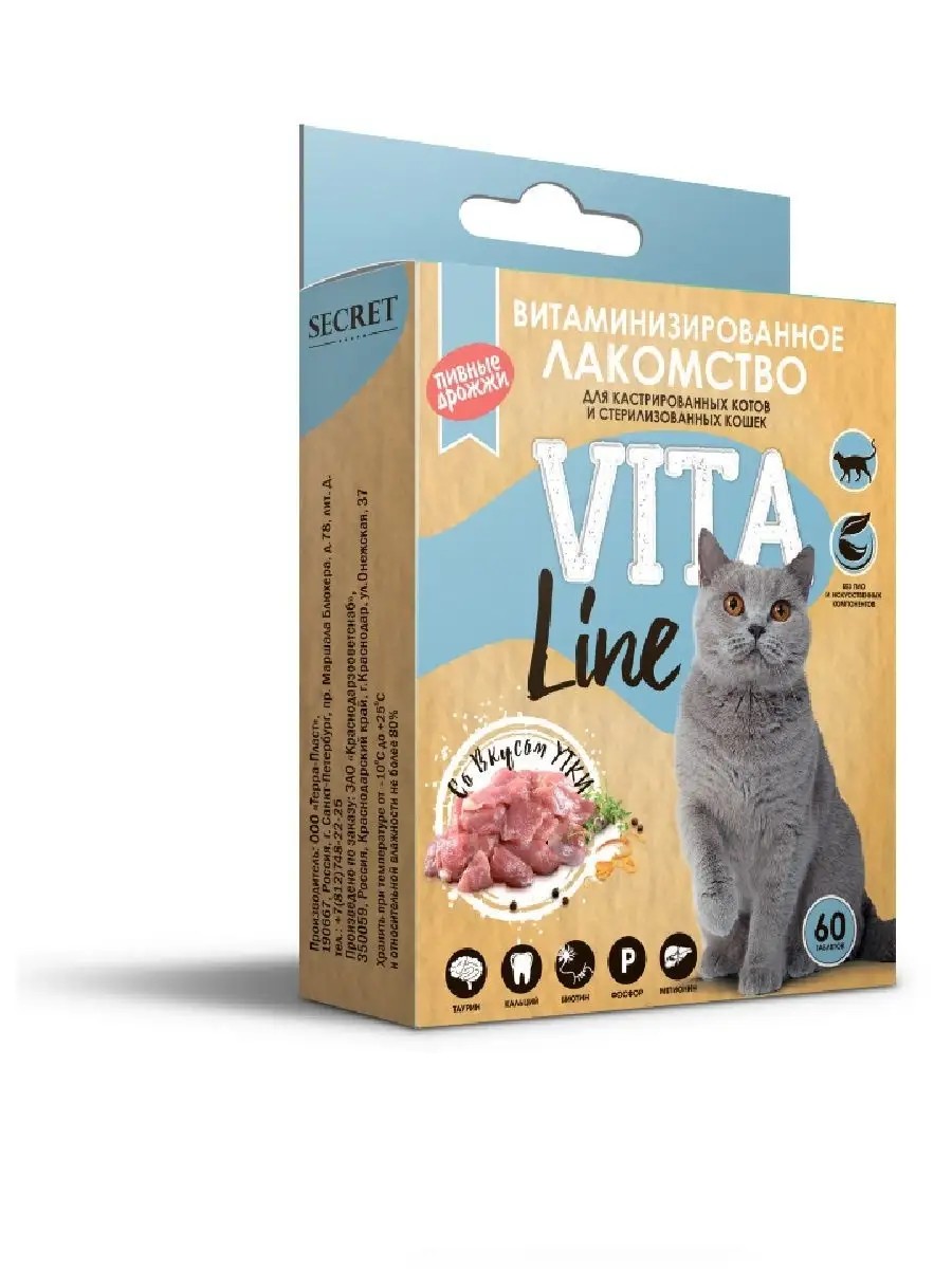 Vitamins for neutered cats, duck flavor, 60 pcs. Secret Multivitamin treat is a tasty and healthy addition to your pet's daily diet. This treat contains essential vitamins and minerals that help strengthen your cat's health and support its immune system. Directions: 5-6 tablets daily. During physical activity and stress, or during the recovery period, the dose can be increased by 1.5-2 times. Ingredients: brewer's yeast, meat and bone meal, dry milk, dry whey, natural duck flavor, vitamins, amino acids, and auxiliary substances. Contents in one tablet: Protein - 35%, Ash components - 25%, Moisture - 12%, Fiber - 6%, Fats - 6%, Phosphorus - 1%, Calcium - 1.5%, Taurine - 1g / kg, Methionine 20g / kg, Biotin - 8.5 mg / kg Brewer's yeast is an important source of vitamins: (A, D3, E, B1, B2, B3, B5, B6, B9), minerals (Ca, P, Mg, Na, Fe, Mn, Zn, Cu, Se) and 18 amino acids. It is not a drug.