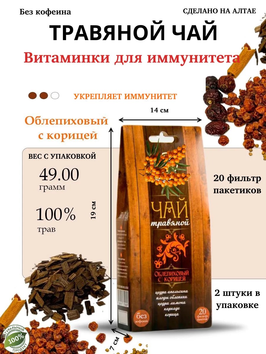 Травяной чай «Облепиховый с корицей» — уникальный напиток, созданный на Алтае. Глубокий солнечный аромат апельсиновой и лимонной цедры сочетается с ярким вкусом облепихи, освежающим каркаде и согревающей корицей. Этот сбалансированный сбор дарит легкую кислинку, цитрусовую свежесть и мягкую пряность, наполняя день позитивной энергией и уютом. Подходит для любого времени суток, помогает поддерживать комфортное самочувствие и наслаждаться натуральной травяной гармонией.