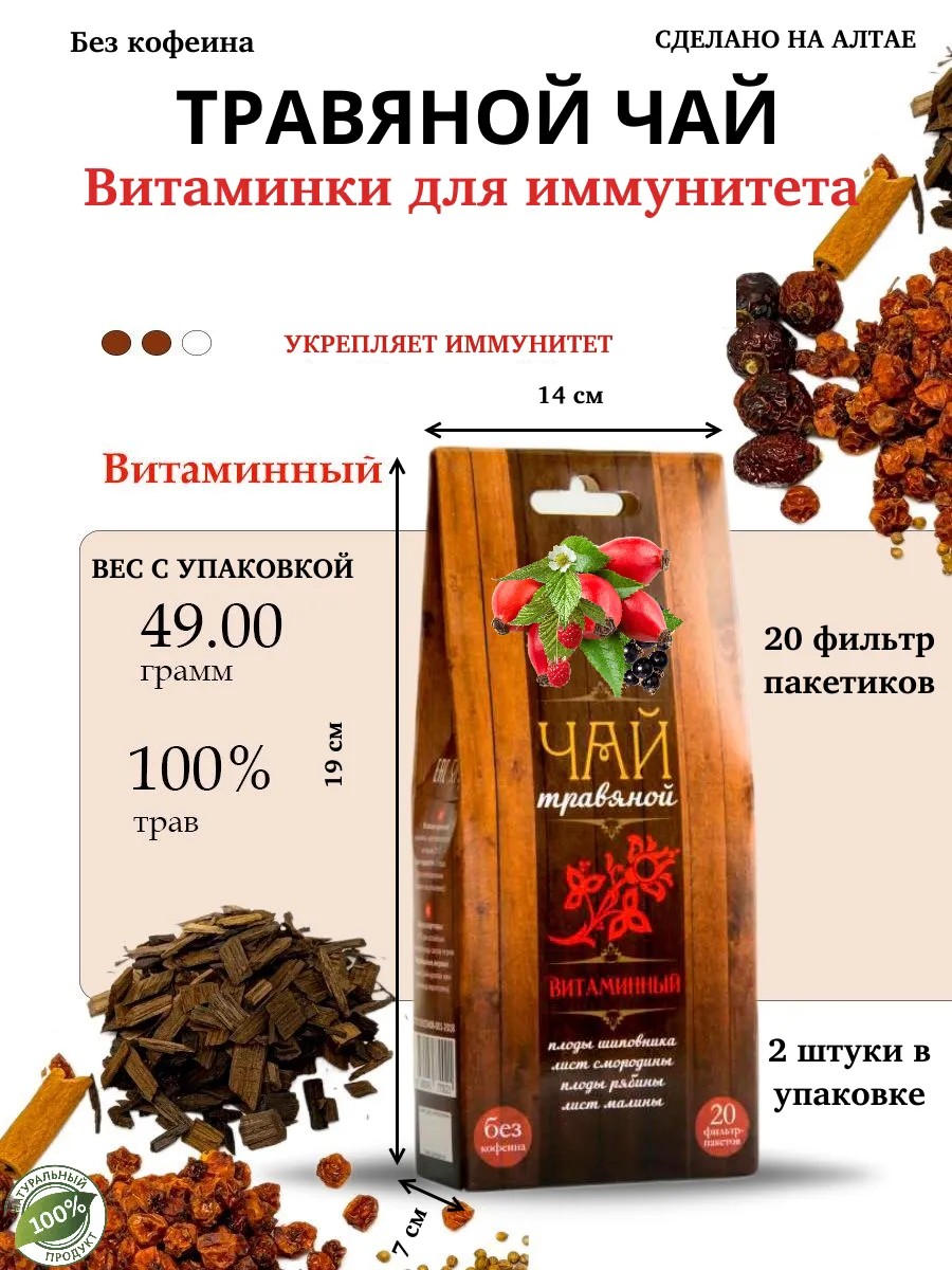 Травяной чай "Витаминный", сделанный на Алтае обладает тонким приятным ароматом и мягким вкусом. Укрепляет иммунитет и помогает организму активировать защитные функции. Происходит из экологически чистых районов Алтая, где трава собирается вручную, сушится естественным способом и сохраняет максимум полезных веществ и ароматов. Чай сибирское здоровье проходит контроль качества и не содержит искусственных добавок.