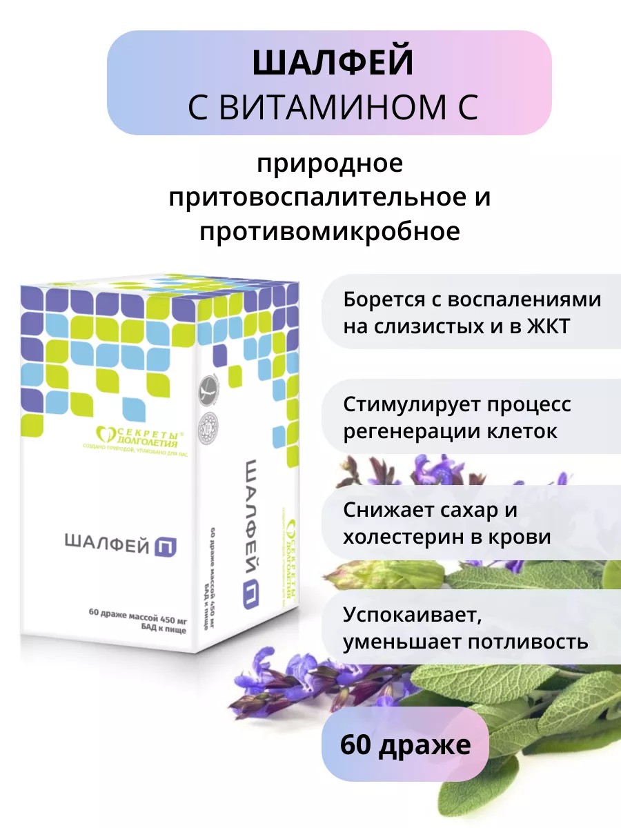 Растительный препарат из шалфея с витамином C противовоспалительного, противомикробного и антисептического действия, производства компании «Парафарм». Шалфей способствует быстрому отходу мокроты. Борется с воспалениями. Понижает уровень сахара и холестерина в крови. Снижает потоотделение при лихорадке и в климактерический период. Стимулирует секрецию желудочного сока и регулирует деятельность желудочно-кишечного тракта. Укрепляет центральную нервную систему и организм в целом. Является мягким седативным средством. Рекомендуется при воспалительных заболеваниях верхних дыхательных путей (стоматите, ангине, ларингите, фарингите, бронхите); для улучшения пищеварения (в частности от спазмов кишечника и вздутия живота); профилактики простатита у мужчин; стабилизации гормонального фона у женщин. Свойства компонентов: шалфей является природным источником силы, красоты и здоровья. В цветах, листьях и стеблях шалфея содержатся флавоноиды, витамины, микроэлементы и ценное эфирное масло (до 2,5% от общего объёма). В целебном эфирном масле шалфея есть цинеол (антисептический компонент) и d-камфора (стимулирует дыхательный центр, улучшает метаболизм в миокарде, ускоряет отхождение мокроты). А противовоспалительное вещество сальвин эффективно борется с болезнетворными бактериями. ВИТАМИН С активно нейтрализует свободные радикалы, стимулирует иммунитет, укрепляет стенки сосудов. ПРЕИМУЩЕСТВА перед аналогами: 1. При производстве препарата используются цельные листья шалфея лекарственного сорта Кубанец со всем многообразием их биологически активных веществ. 2. В препарате используются цельные части растений, а не экстракты из них. 3. При производстве концентрата применяется технология криообработки, что позволяет добиться максимальной сохранности всех действующих веществ и лучшего измельчения, а значит – более эффективного усвоения действующих веществ. 4. Целебные свойства шалфея усилены мощным антиоксидантом – витамином С. 5. Форма драже более удобна по сравнению с капсулами, таблетками, чаями и настоями. Способ применения: по 1-2 драже 3 раза в день (рассасывать во рту). Продолжительность приёма – 7-10 дней. При необходимости повторить курс для получения устойчивого результата.