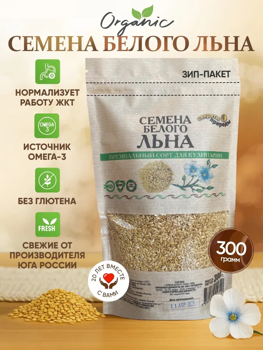Натуральные семена белого льна «Секреты природы» – это кладезь полезных веществ для вашего здоровья и красоты. Белые семена имеют более нежную оболочку и мягкий вкус. Очищенные семена, богатые растительным белком, жирами и углеводами, станут отличным дополнением к вашему рациону. Добавляйте всего по 1-2 ст. ложки в каши, салаты, выпечку или смузи. Семена льна – это настоящий суперфуд, содержит клетчатку, помогающую вам поддержать здоровье пищеварительной системы, улучшить работу сердца и сосудов, а также содержание Омега-3 поможет сохранить красоту волос и кожи. Упаковки объемом 300 грамм – удобный объём для ежедневного использования, чтобы вы могли наслаждаться всеми преимуществами этого ценного продукта.