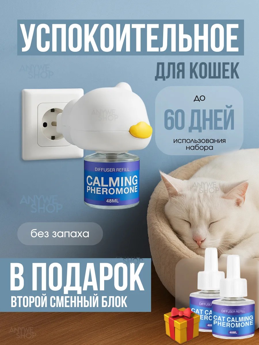 Успокоительное для кошек без запаха - комплект из двух флаконов успокоительной жидкости и электрического диффузора.