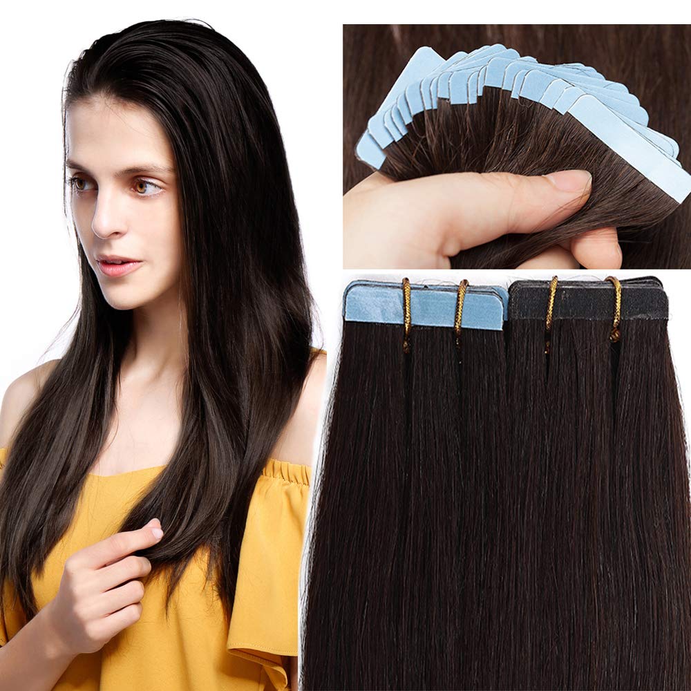SEGO 40 cm Tape Extensions Real Hair 20 pieces 30g Adhesive Hair Extension Hairpieces 100% Remy Human Hair Dark Brown#2
