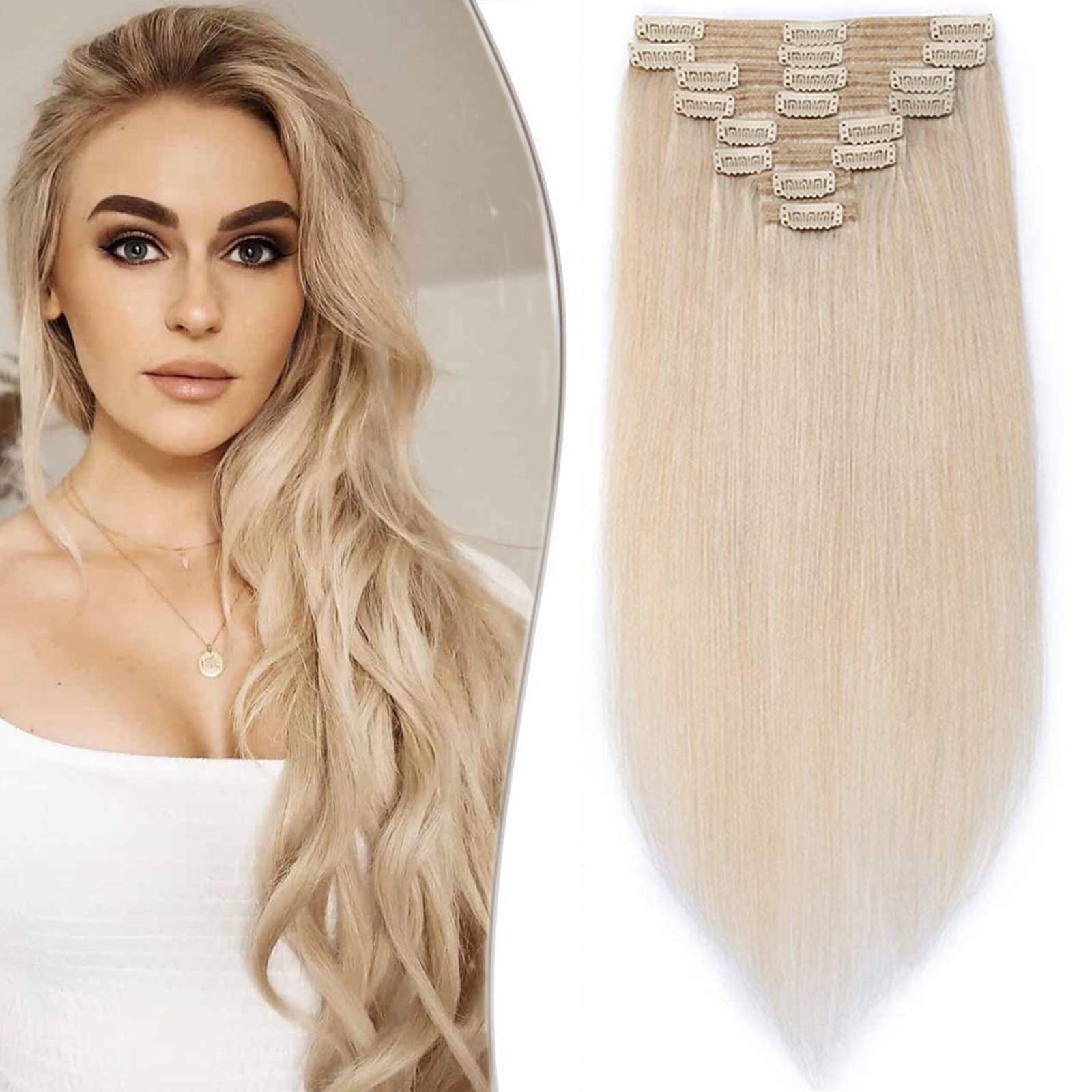 SEGO Clip in Extensions Echthaar 8 Teiliges SET Doppelt Tressen Haarverlängerung 100% Remy Hair für Komplette Kopf Weißbleichen#70 18"(45cm)-140g