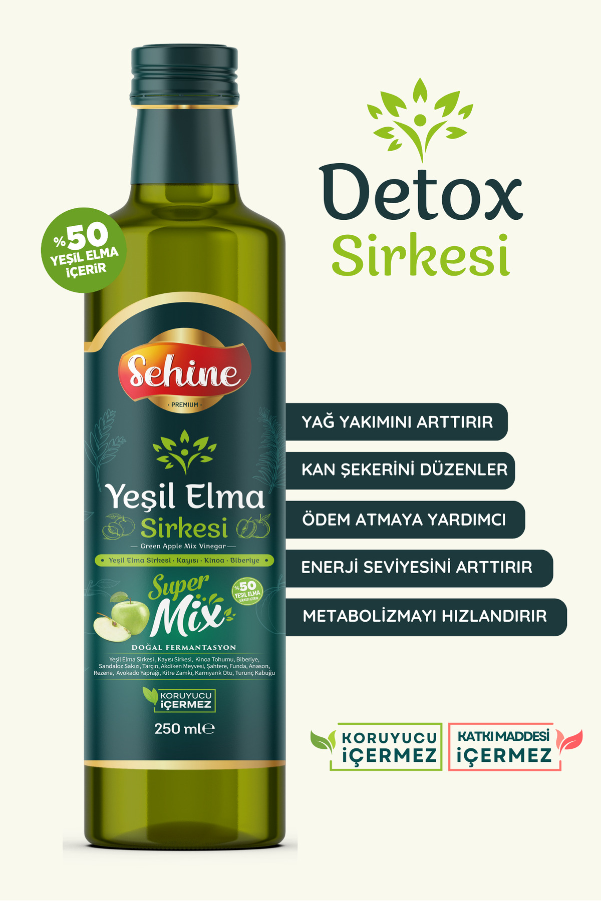• Vücudunuzdaki toksinleri ve ödemleri dogal yollarla temizlemeye yardimci olan yesil elma sirkesi, detoks rutininizin vazgeçilmez bir parçasi haline gelir.