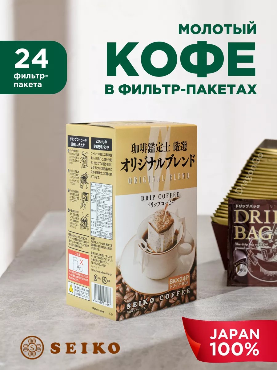 Японский натуральный молотый кофе в фильтрах дрип-пакетах для заваривания в кружке Seiko станет незаменимым атрибутом вашего утра, стоит только попробовать. Кофе обладает насыщенным, приятным вкусом и ярким ароматом. В упаковке 24 дрип пакета, в которых по 8 грамм кофе - оптимальное количество кофеина на чашку. Процесс приготовления: разверните пакет, установите на чашку и залейте горячей водой. Позвольте напитку настоятся 2 минуты и бодрящий напиток готов!Качество японского напитка не оставит вас равнодушным, а приятная кислинка порадует вкусовые рецепторы. Прекрасно сочетается со сливками или молоком. Фильтр-кофе удобно брать с собой в в офис, путешествие, дорогу.