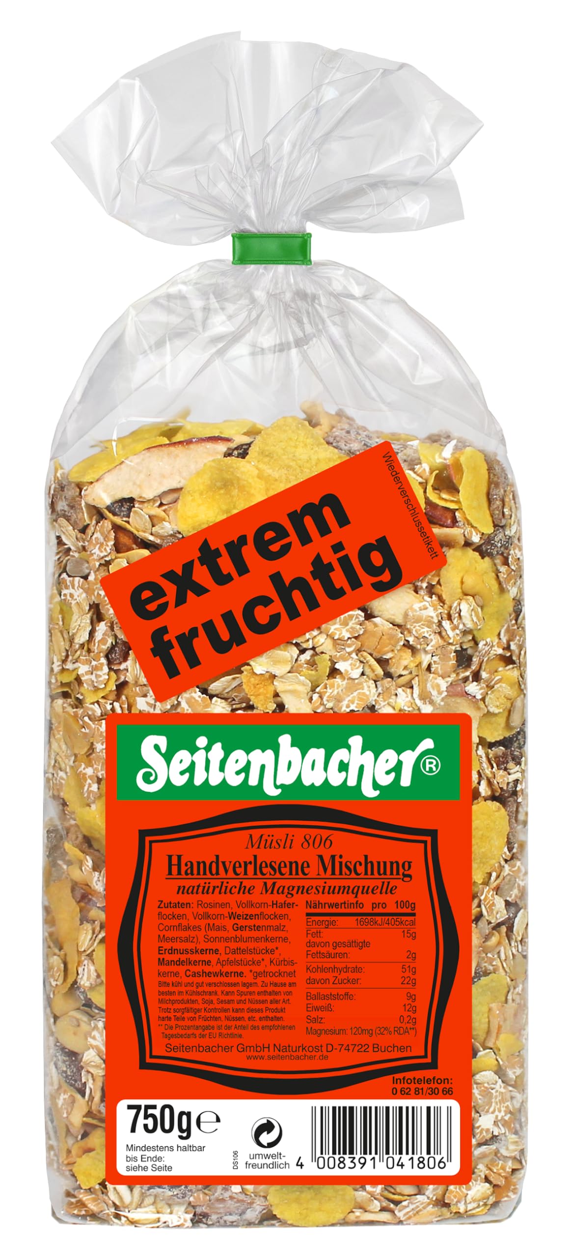 The muesli mix for gourmets. This balanced mix of whole wheat flakes, lots of fruits and crunchy nuts guarantees an absolute delicacy. For maximum enjoyment and natural quality, the ingredients of this muesli are selected by hand. -Muesli 806 -protein source -high fiber content -crunchy almonds, peanuts and cashew nuts -with raisins INGREDIENTS raisins, whole wheat oatmeal, whole wheat flakes, corn flakes (corn, barley malt, sea salt), sunflower seeds, peanuts, date pieces , almond kernels, apple pieces , pumpkin seeds, cashew seeds. dried SAFETY WARNING Do not expose to direct sunlight. See moreSeitenbacher Muesli Handgeselecteerd mengsel (1 x 750 g verpakking) De mueslimix voor fijnproevers. Een absolute lekkernij garandeert deze evenwichtige mix van volkorenvlokken, veel vruchten en knapperige noten. Voor maximaal genot en natuurlijk kwaliteit worden de ingrediënten van deze muesli met de hand geselecteerd. -Muesli 806 -eiwitbron -hoog vezelgehalte -knapperige amandelen, pinda's en cashewnoten -met rozijnen INGREDIËNTEN rozijnen, volkoren havermout, volkoren tarwevlokken, cornflakes (maïs, gerstemout, zeezout), zonnebloempitten, pinda's, stukjes dadels , amandelpitten, appelstuks , pompoenpitten, cashewpitten. gedroogd VEILIGHEIDSWAARSCHUWING Niet blootstellen aan direct zonlicht. Meer bekijken