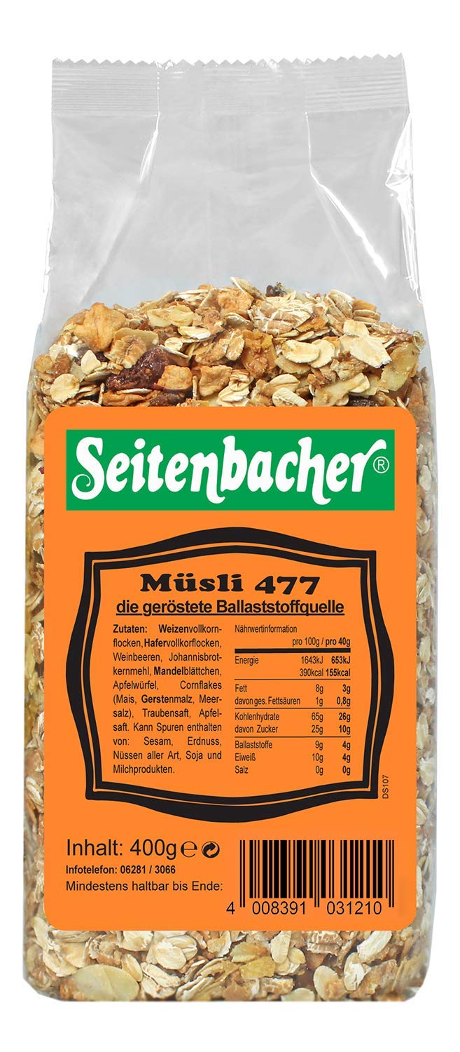 A balanced whole grain flake mixture of whole wheat and whole wheat flakes is rounded off with unsulphured wine berries, delicate almond leaves and crispy apple cubes. Krosse corn flakes provide the extra crunchy taste. Protein source high fiber content muesli 477 Good to know: diced apples are probably the most popular table fruit in the world. There are countless types of delicious snack. The most widely grown apple variety in the world is Golden Delicious, this table apple is green-yellow and very sweet. There are more than 1,000 varieties of table apples alone. To use apples in dry granola mixes, the apples must be cut and dried. INGREDIENTS whole wheat flakes, whole wheat flakes, wine berries, almond leaves, honey, apple cube, corn flakes (corn, barley malt, sea salt).Seitenbacher Muesli geroosterd (1 x 400 g) Een uitgebalanceerd volkorenvlokkenmengsel van volkoren tarwe- en volkorenvlokken wordt afgerond met ongezwavelde wijnbessen, delicate amandelblaadjes en knapperige appelblokjes. Krosse cornflakes zorgen voor de extra knapperige smaak. Eiwitbron hoog vezelgehalte muesli 477 Goed om te weten: appelblokjes zijn waarschijnlijk het populairste tafelfruit ter wereld. Er zijn talloze soorten heerlijke snack. De meest geteelde appelvariëteit ter wereld is Golden Delicious, deze tafelappel is groen-geel en zeer zoet. Alleen al bij tafelappels zijn er meer dan 1000 soorten. Om appels in droge mueslimengsels te kunnen gebruiken, moeten de appels worden gesneden en gedroogd. INGREDIËNTEN volkoren tarwevlokken, volkorenvlokken, wijnbessen, amandelblaadjes, honing, appelkubus, cornflakes (maïs, gerstemout, zeezout).
