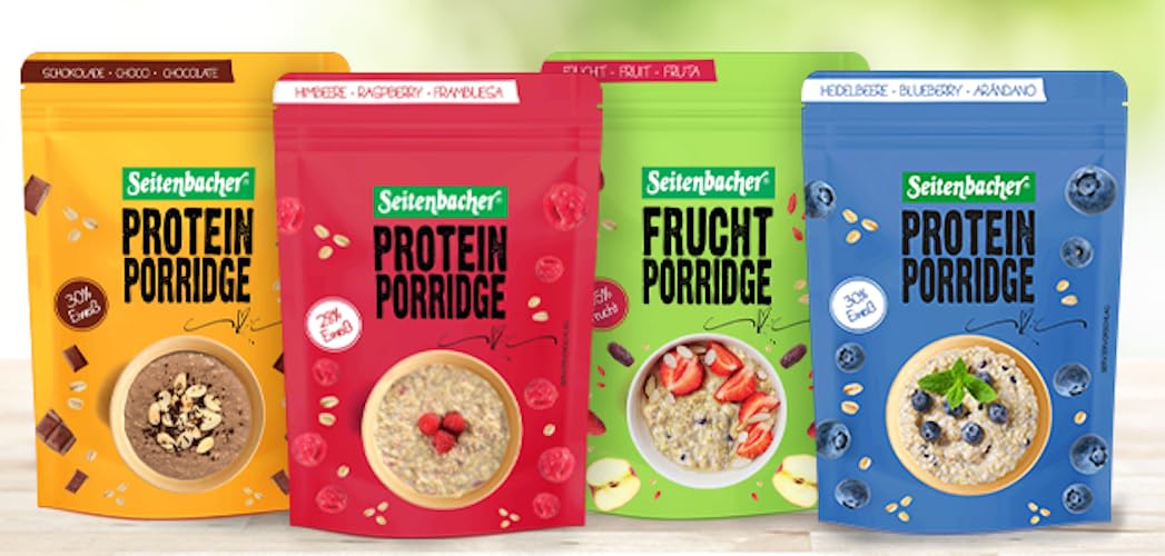 Porridge is delicious and gives you a pleasant feeling in your stomach. It spreads a pleasant warmth throughout your body and gives you a real energy boost. Read here what's in our porridge, how to prepare it, and how it helps you maintain a healthy and active diet. For a healthy diet: Our porridge is made with whole wheat oat flakes containing important nutrients, plus dried fruit. We ensure a smooth finish. Our whole grains come from local farmers in Baden-Württemberg. In this way, we support domestic agriculture. For more power during sports: Many strength athletes, as well as joggers, mountain bikers, and road cyclists, use Seitenbacher products because they want to consume protein in a healthy way. For them, we have protein-rich porridge with raspberries or chocolate. For a good figure: Many people want to eat low-calorie meals. Porridge is a secret tip here. Porridge does contain calories – but you'll eat less sausage, cheese, and other high-calorie foods. Porridge keeps you feeling full for a long time. No more cravings! INGREDIENTS Chocolate: Wholegrain oat flakes, milk protein, chocolate (cane sugar, cocoa butter, whole milk powder, cocoa powder, emulsifier: rapeseed lecithin), pancake protein (pea protein, rice flour, wheat protein), fructose, defatted cocoa powder Raspberry: Wholegrain oat flakes, milk protein, fruit, fructose, freeze-dried raspberry berries, poppy oil, natural flavoring Fruit: Wholegrain oat flakes, dried dates, dried apple pieces, goji berries, unsweetened pineapple cubes, toasted coconut chips, freeze-dried strawberry pieces Blueberry: whole grain oat flakes, milk proteins, cane sugar, 3 freeze-dried blueberries, poppy oil, natural flavoring, red beetroot juice concentrate, sea salt.Seitenbacher Lot de 2 paquets de 4 sachets de 500 g de protéines de porridge I Chocolat I Framboise I Myrtille I Blanc d'oeuf I Sans blé I Grain entier I AvoineDESCRIPTION DU PRODUIT DESCRIPTION DU PRODUIT Le porridge est délicieux, vous donne une sensation agréable dans l'estomac. Il diffuse une chaleur agréable dans tout le corps et vous donne un véritable regain d'énergie. Lisez ici ce qu'il y a dans notre bouillie, comment la préparer - et comment elle vous aide à maintenir une alimentation saine et sportive. Pour une alimentation saine Notre bouillie est composée de flocons d'avoine de blé entier avec des nutriments importants, plus des fruits secs. Nous veillons à une finition douce. Nos céréales complètes proviennent d'agriculteurs locaux du Bade-Wurtemberg. Ainsi, nous soutenons l'agriculture domestique. Pour plus de puissance pendant le sport De nombreux athlètes de force, mais aussi les joggeurs, les cyclistes de montagne et les cyclistes de route utilisent les produits Seitenbacher car ils veulent consommer des protéines sur une voie saine. Pour eux, nous avons du porridge riche en protéines avec des framboises ou du chocolat. Pour une bonne silhouette Beaucoup de gens veulent manger à faible teneur en calories. Porridge est un conseil secret ici. Il y a aussi des calories dans le porridge – mais vous utilisez moins souvent des saucisses, du fromage et d'autres aliments riches en calories. La bouillie est rassasiée pendant longtemps. Fini les fringales ! INGRÉDIENTS Chocolat : flocons d'avoine complètes, protéines de lait, chocolat (sucre de canne, beurre de cacao, poudre de lait entier, poudre de cacao, émulsifiant : lécithine de colza), protéine de crêpes (protéines de pois, farine de riz, protéine de blé), fructose, poudre de cacao dégraissée I Framboise : flocons d'avoine complète, protéines de lait, fruits. ktose, framboise Baies lyophilisées, huile de pavot, arôme naturel.I Fruit: flocons d'avoine entier, dattes séchées, morceaux de pomme séchés, baies de goji, cubes d'ananas non sucrés, chips de coco grillées, morceaux de fraise lyophilisés. I Myrtille : flocons d'avoine complète, protéines de lait, sucre de canne, myrtilles lyophilisées à 3 , huile de pavot, arôme naturel, concentré de jus de betterave rouge, sel marin.